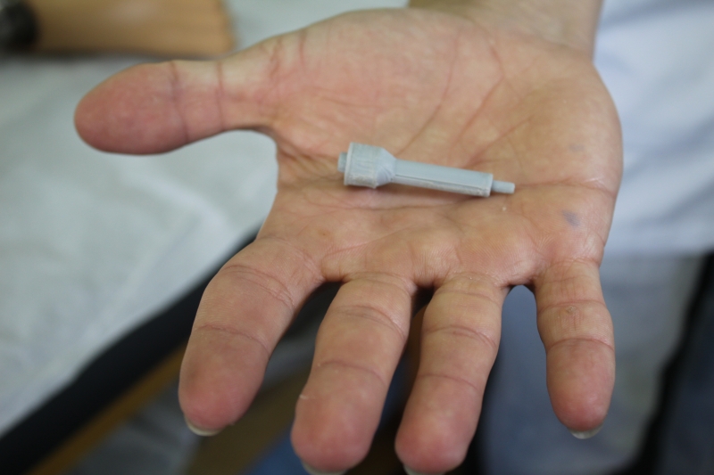 A solução foi encontrada bem perto, no próprio Campus do Centro Universitário FAG. O auxiliar de protético e acadêmico de Engenharia Mecânica, Alison Giordani, foi acionado pela equipe da Clínica para tentar fazer a peça em uma das impressoras 3D da Instituição. Ele tinha o domínio do software para o projeto, mas para fazer o uso da impressora buscou a ajuda do professor e Coordenador Adjunto de Engenharia de Controle e Automação, Helder Carozzi. "Existiram algumas coisas que precisaram ser ajustadas no desenho para que a impressora conseguisse fazer. Após isso, fizemos as peças-piloto com alguns tipos de materiais, mas os melhores encontrados para esse tipo de trabalho foram o PLA (poliácido láctico) e o ABS (acrilonitrila butadieno estireno). Tecnicamente falando, a impressora 3D não tem limitações para impressão. Qualquer forma, qualquer geometria pode ser executada, depende da criatividade", detalha Helder.