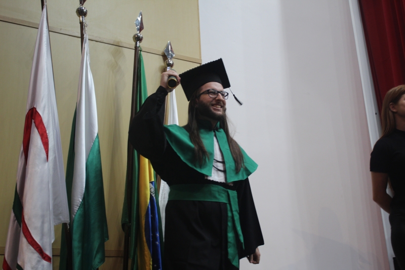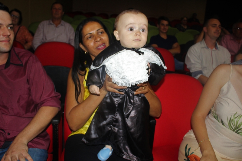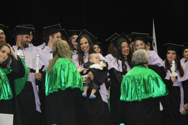 Em meio à plateia um pequeno "formando" chamou a atenção. Jéssica Daiane da Silva fez questão de levar o filho Théo vestido de beca (vestimenta tradicional dos formandos), afinal ele esteve presente na maior parte da graduação. Hoje o bebê está com sete meses. A licenciada em Letras descobriu a gravidez quando estava na metade do curso e, mesmo sabendo das dificuldades prosseguiu com os estudos, com o Théo na barriga e depois no colo. Ela conta que teve uma grande rede de apoio. "Meu marido (Rodrigo Ceroni) vinha todos os dias e ficava com ele no estacionamento, e nos intervalos eu amamentava. Minha amiga Carol Gallina também me ajudou, ela cuidava do Théo para eu poder fazer os estágios. Os professores me apoiaram muito, com compreensão e carinho. Agradeço também a compreensão da escola na qual trabalho, por serem flexíveis", relembra Jéssica.