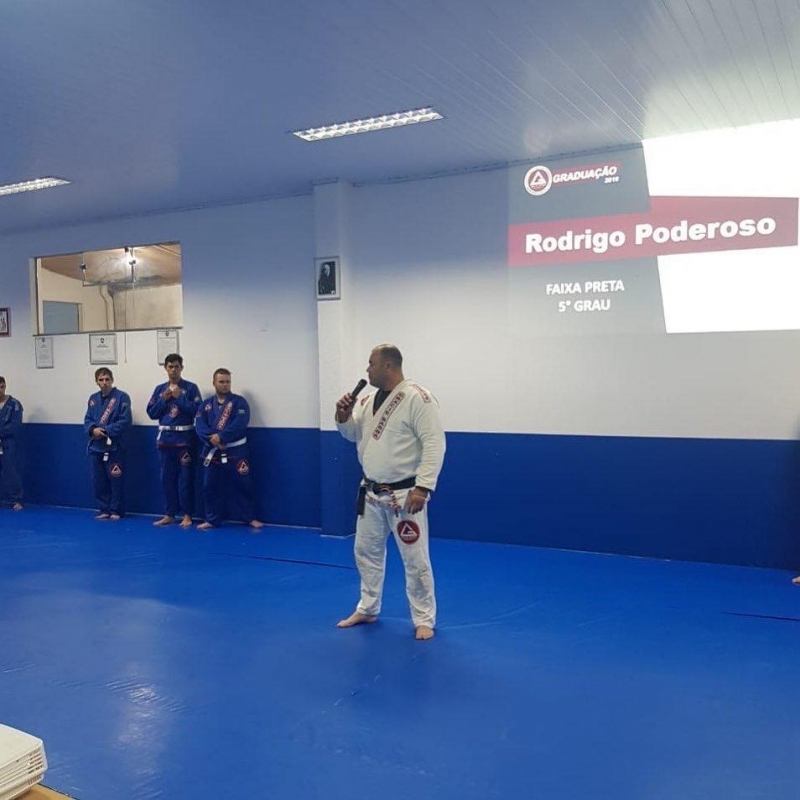 O professor de Educação Física do Centro Universitário FAG, Rodrigo Poderoso, é uma referência no jiu-jitsu. O docente deu mais um passo em sua busca por aperfeiçoamento: alcançou o 5º grau na arte marcial - em uma escala que vai de 1 a 10. Com a nova graduação, ele passa a ser o segundo praticante mais graduado do Paraná e está entre os 30 mais graduados do mundo pela IBJJF (International Brazilian Jiu-Jitsu Federation), órgão responsável pela graduação mundial da arte marcial.
