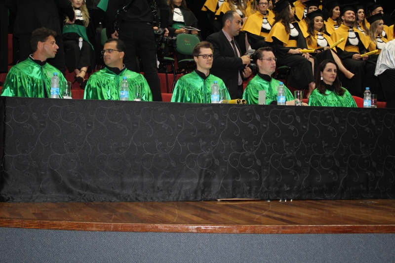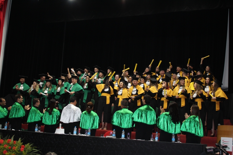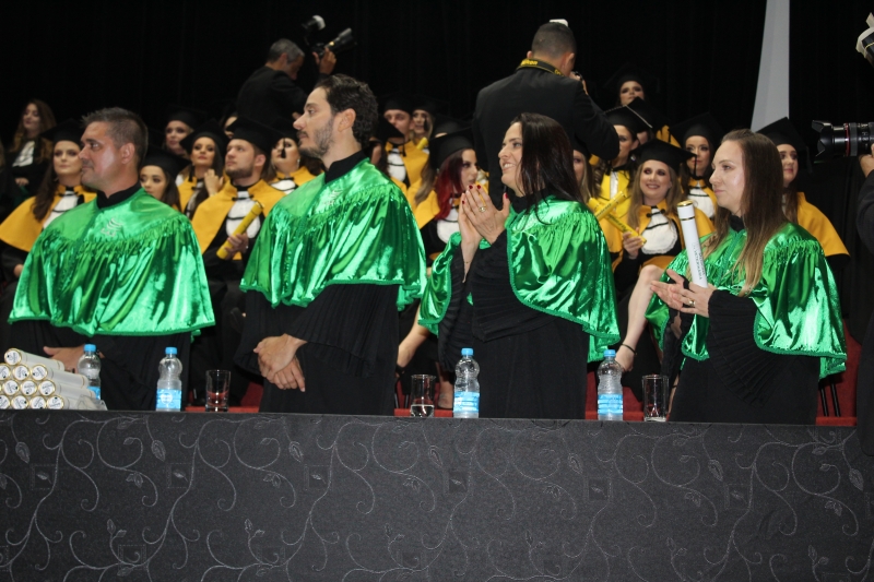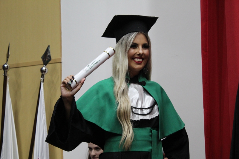 Mais tarde, foi a vez da turma de Farmácia e da turma de Medicina Veterinária Integral participarem da cerimônia. Fizeram parte da mesa de honra: a Coordenadora do Curso de Farmácia, Patrícia Stadler Rosa Lucca; o Coordenador Adjunto, Giovane Douglas Zanin; o Paraninfo, João Ricardo Rutkauskis; o Patrono, Claudinei Mesquita da Silva; o Homenageado como Nome de Turma, Emerson da Silva Machado; o Coordenador de Medicina Veterinária, Adriano Ramos Cardoso; o Paraninfo e Conselheiro do CRMV, Edmilson Santos de Freitas; a Patronesse, Michelly Kheidy Borges Battisti; e a Homenageada como Nome de Turma, Camila Leseux Macedo de Alencar.