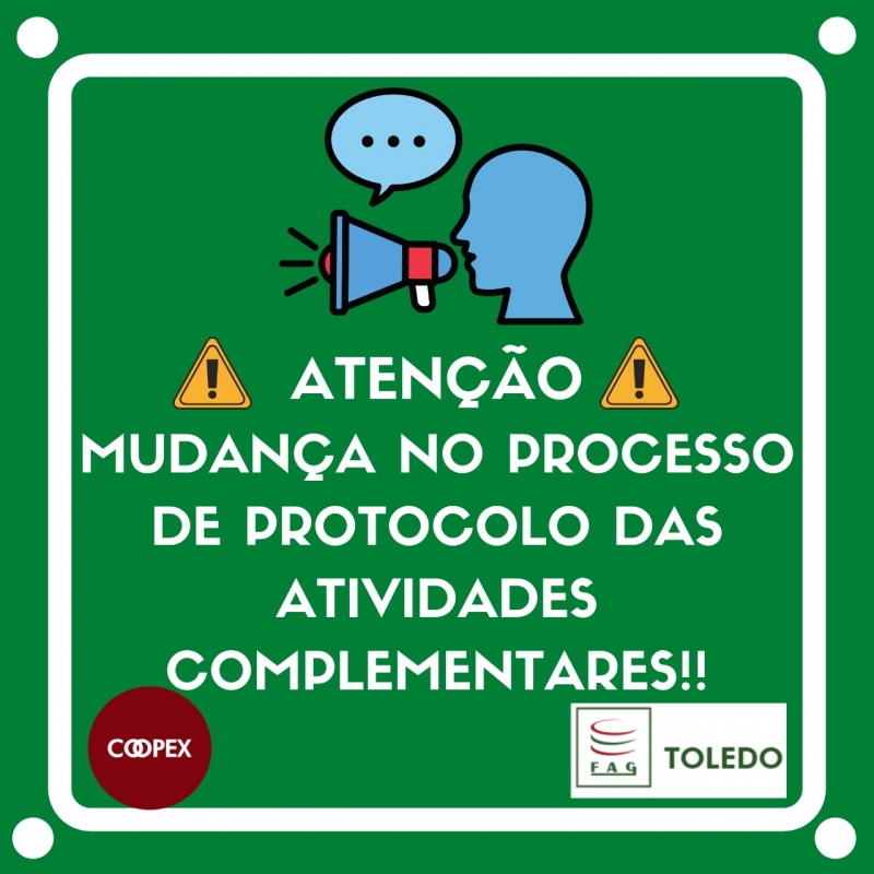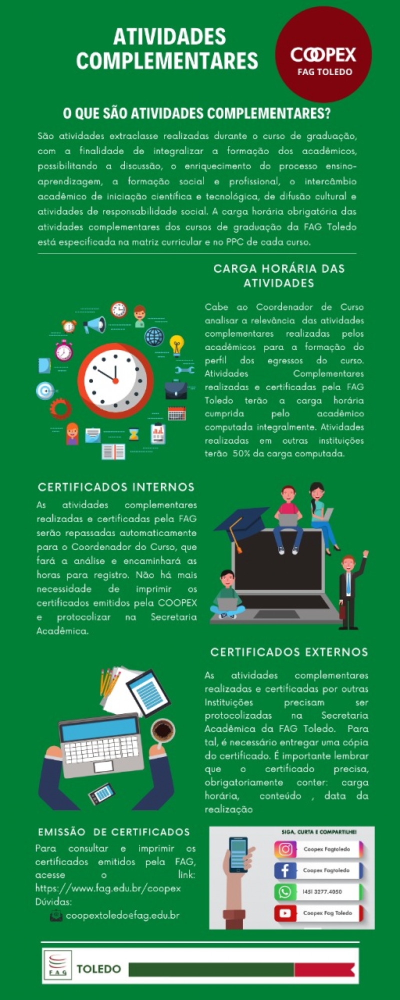 A Coordenação de Pesquisa e Extensão (Coopex) da FAG Toledo realiza uma campanha para alertar os acadêmicos da graduação sobre como protocolar as atividades complementares. Os certificados são obrigatórios para a finalização dos cursos. "Estas atividades têm como finalidade integralizar a formação dos acadêmicos, enriquecendo o processo de ensino-aprendizagem, a formação social e profissional, o intercâmbio entre acadêmicos em projetos de iniciação científica e tecnológica, sem falar da difusão cultural e das atividades de responsabilidade social que também são fundamentais para a formação", explica a coordenadora da Coopex, Maristela Bendo.