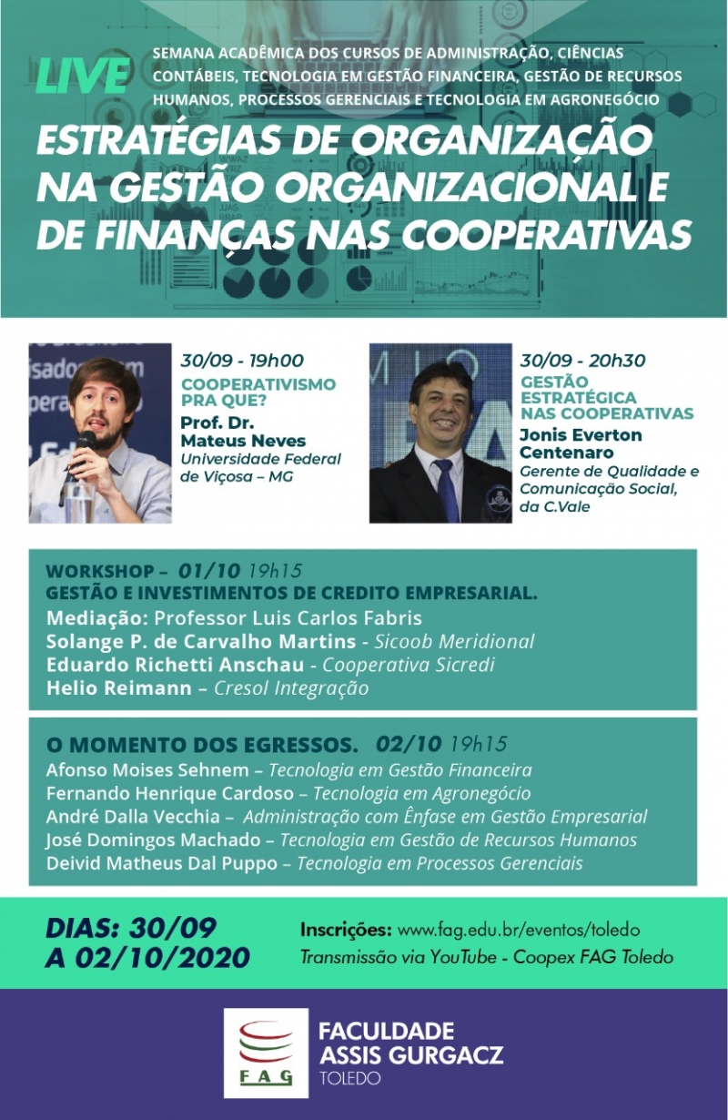 Os cursos de Ciências Contábeis; Tecnologia em Gestão Financeira; Gestão de Recursos Humanos; Processos Gerenciais e Gestão do Agronegócio da FAG Toledo vão realizar entre os dias 30 de setembro e dois de outubro uma Semana Acadêmica especial e conjunta que terá como tema "Estratégias de Organização na Gestão Organizacional e de Finanças nas Cooperativas".