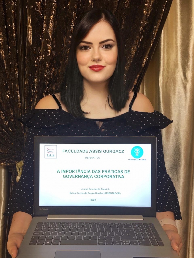O Trabalho de Conclusão de Curso (TCC) da acadêmica Louise Dietrich foi um dos destaques nas bancas do curso de Ciências Contábeis da FAG Toledo. A estudante trabalhou com o tema "A importância das Práticas de Governança Corporativa no Mercado de Capitais". O tema é bastante atual e vem recebendo a cada dia mais destaque, pois fomenta a transparência acerca das demonstrações financeiras da empresa aos seus investidores. A aluna foi orientada pela professora Édina Kinzler durante a elaboração da pesquisa e tirou nota máxima na banca, apresentando argumentos sobre a contribuição das boas práticas de governança na qualidade da gestão das organizações, sua longevidade no mercado financeiro e valor econômico e o alinhamento dos interesses entre os sócios majoritários e acionistas. A nota, de acordo com a acadêmica, é resultado de um trabalho mais desafiador do que o esperado. "Este ano de 2020 foi um marco na vida de todos os acadêmicos, onde aprendemos a superar nossas limitações perante o ensino à distância, devido a pandemia. Os alunos e professores se uniram na busca pela excelência, a cada atividade proposta, cada vídeo-aula gravada e principalmente no apoio e orientação dos nossos queridos professores, que não mediram esforços para nos passar conhecimento, mesmo que de forma remota", comenta.