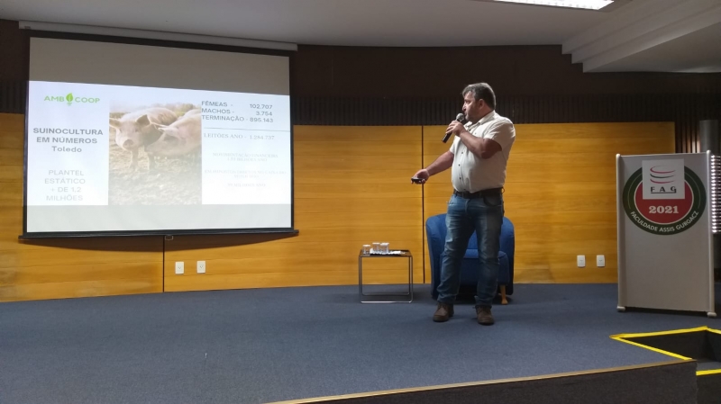 O convidado Neudi Mosconi explanou sobre a atuação da empresa alemã Le-Me Biogás no cenário de produção de bioeletricidade por meio do uso de dejetos de suínos. Mosconi já foi secretário de Desenvolvimento Ambiental de Toledo e expôs sobre os potenciais de sustentabilidade na produção energética no município. O convidado destacou que Toledo tem possibilidade de ser o primeiro município brasileiro com capacidade de sustentar sua demanda energética com o aproveitamento dos resíduos da atividade suinícola.