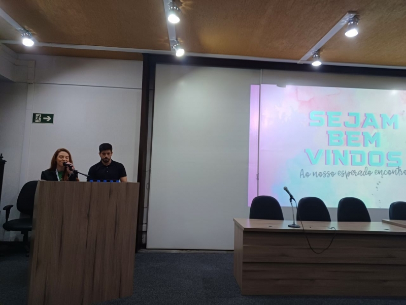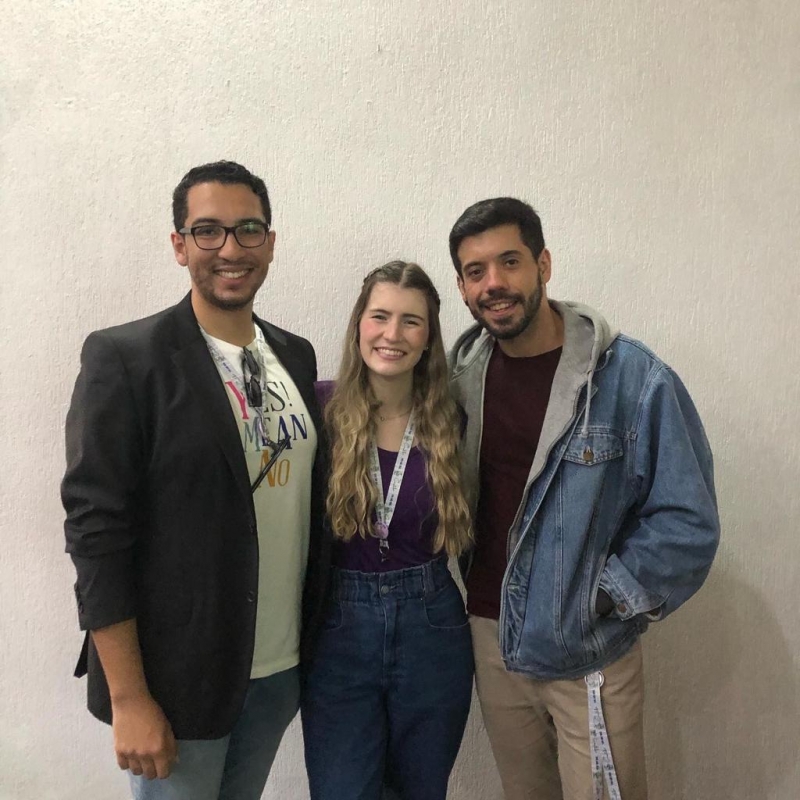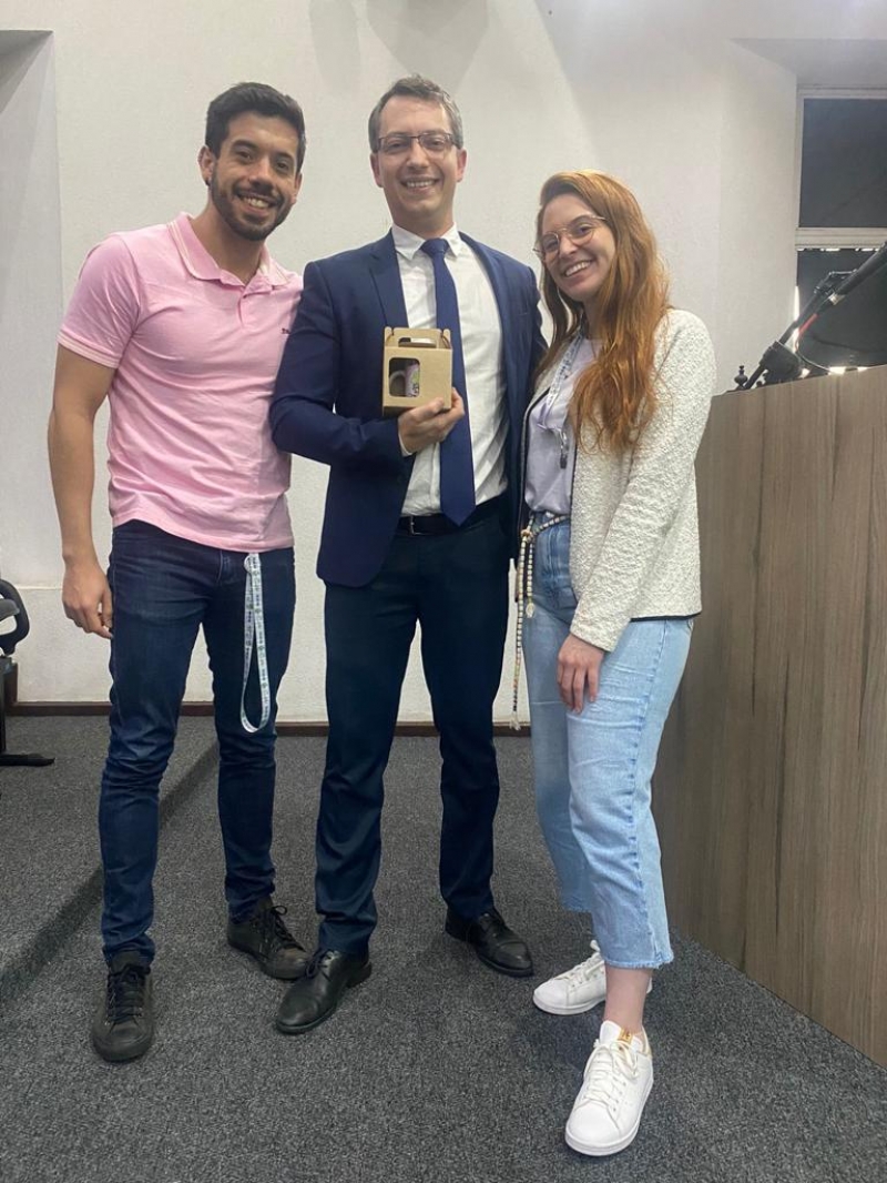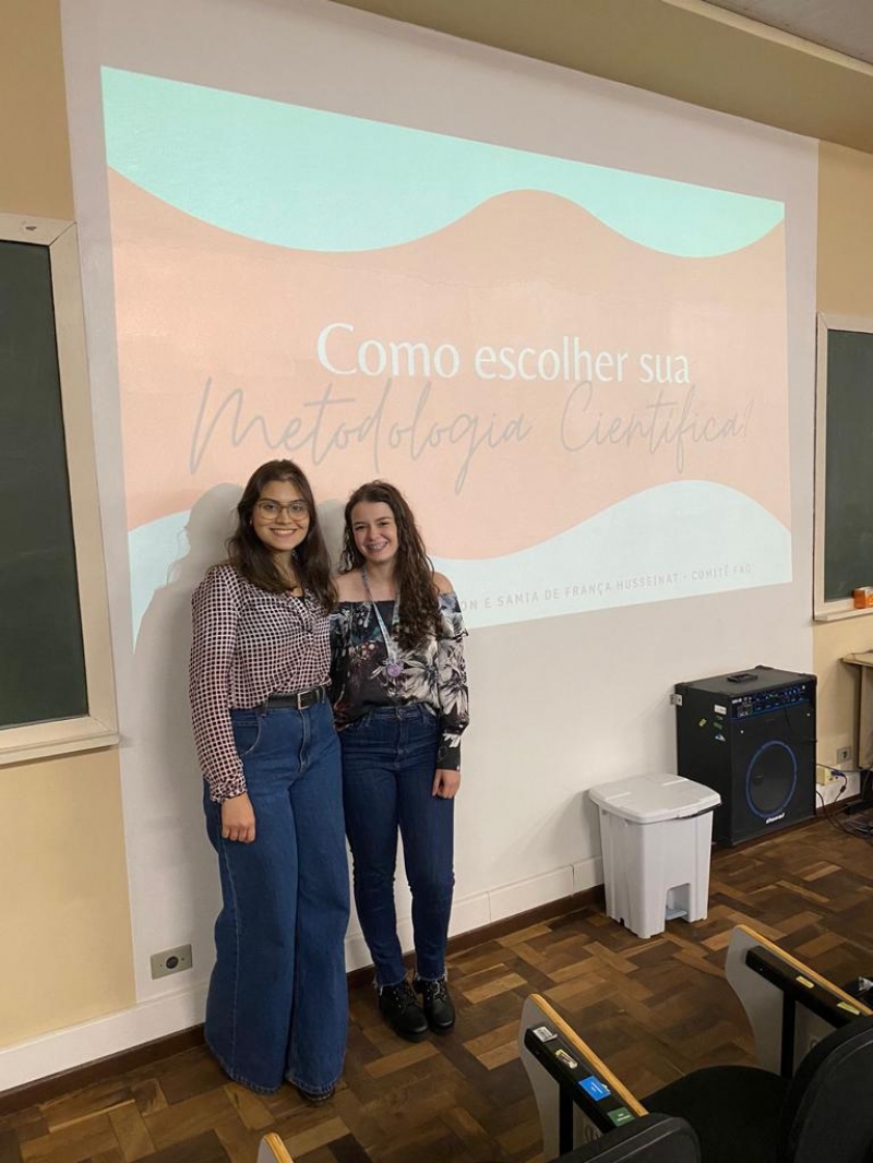 Guilherme Henrique da Costa Ferreira, acadêmico do 4° período e coordenador nacional de programas; Mariana Silva Possobom e Sâmia Husseinat, também do 4° período, apresentaram sessões de planejamento estratégico e metodologia científica no momento de pesquisa.