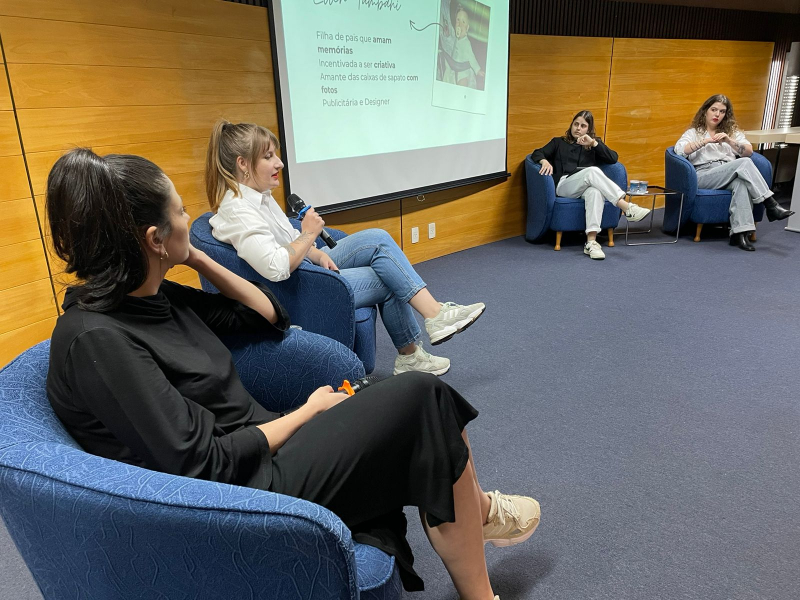 Na segunda parte da noite, os alunos assistiram uma mesa com o tema “Made in Interior”, com as convidadas Eduarda Albuquerque, Helen Tombani e Francine Franco. As profissionais falaram de suas trajetórias na Comunicação e Design.