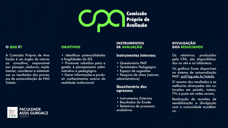 A CPA da FAG Toledo é composta por representantes do setor administrativo, acadêmicos, corpo docente, coordenações de cursos e sociedade civil. Juntos, são discutidos instrumentos de autoavaliação como o PAIF, Termômetro Pedagógico e Pesquisa de Clima. A pesquisa é anônima, feita através de formulários próprios, Google Forms ou impressos. Após a campanha, os dados são compilados e divulgados através de cartazes, totens, portal do aluno, site e redes sociais.