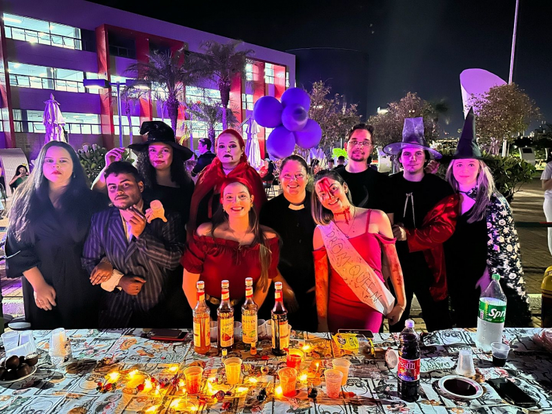 Para completar a experiência, os participantes tiveram acesso a uma variedade de lanches e guloseimas, com pipoca, picolé e diversas opções de “doçuras e travessuras”, mantendo o espírito do Halloween em todos os detalhes. “Foi uma oportunidade única de interação entre todos e de vivenciar a cultura de uma forma lúdica e divertida. Ver nossos alunos se engajando tão intensamente mostra como atividades assim são essenciais para o desenvolvimento da linguagem e expressão cultural. Acredito que essa imersão não só aproxima nossos acadêmicos da cultura inglesa, mas também fortalece o espírito de equipe e a criatividade. O Halloween se tornou uma tradição querida e esperada no curso de Letras, enriquecendo ainda mais nossa comunidade acadêmica”, explica a coordenadora do curso, Danieli Sanderson.