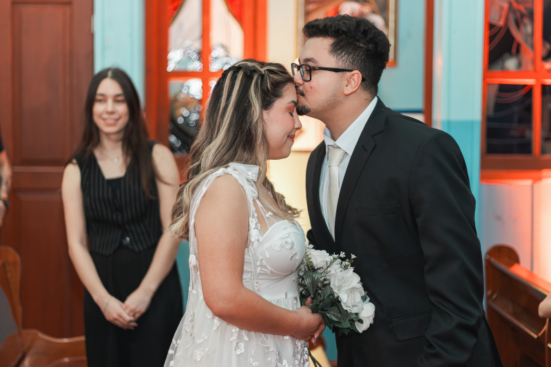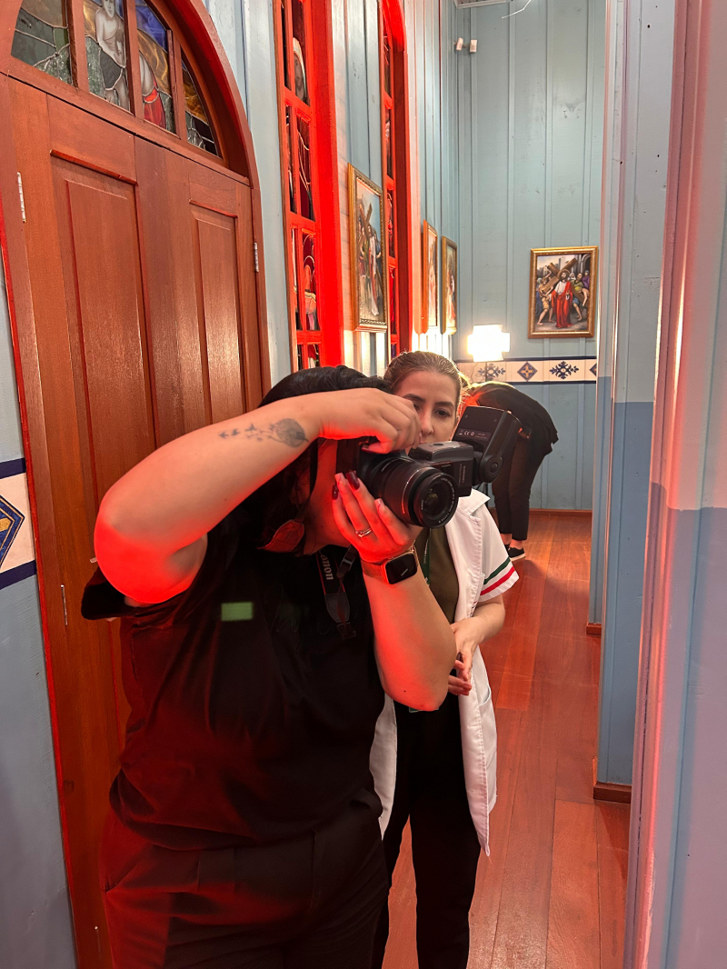 "Aproveitando a estrutura que o Centro FAG disponibilizada aos professores e alunos, a turma organizou um casamento fictício com noivos, padre e decoração, podendo assim exercer a prática da fotografia de casamento e ter uma noção real de como trabalhar iluminação, enquadramento, poses, direção e todas as técnicas específicas dessa área fotográfica", explica Luana.