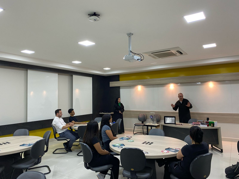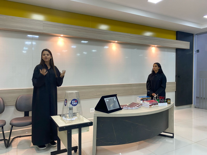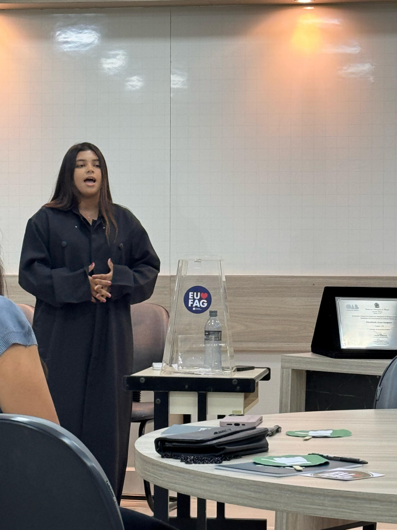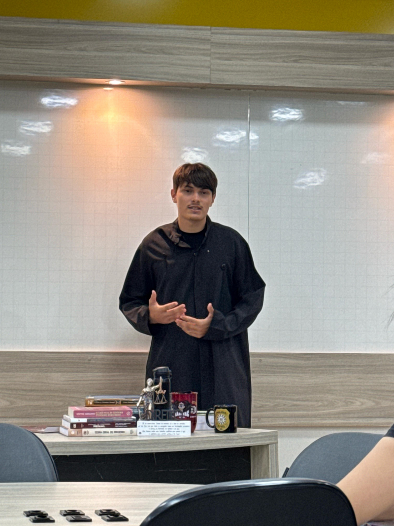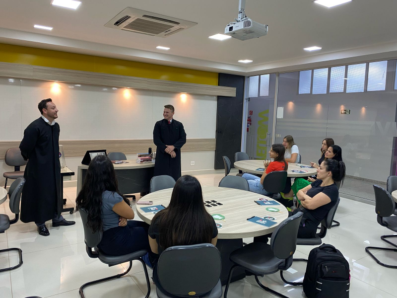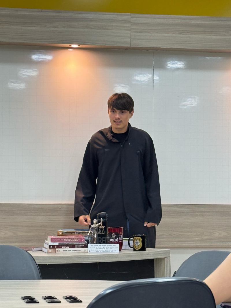 Os calouros de Direito foram recebidos no primeiro dia de aula com um desafio organizado pela coordenação do curso. O duelo argumentativo, como uma simulação de júri, foi realizado com a participação dos novos acadêmicos e de alunos veteranos. A professora Gabrielle Zotti organizou o acolhimento, selecionando temas que foram sorteados pelos grupos, que tiveram de organizar e fazer apresentação oral com argumentos favoráveis e contrários aos temas. Os demais alunos que estavam na sala durante a atividade votaram nas melhores atuações. "Foi uma atividade muito produtiva, com os alunos participando, argumentando, usando as becas, com uma experiência de júri simulado. Os alunos terão muito contato com eventos reais, de práticas, de atendimento, de elaboração de processos, provas e atendimentos ao público, quando estiverem fazendo os estágios nos nossos projetos e NPJ. Foi uma vivência para realmente sentirem, já de início, esta grande jornada", explica a professora, coordenadora adjunta do curso.