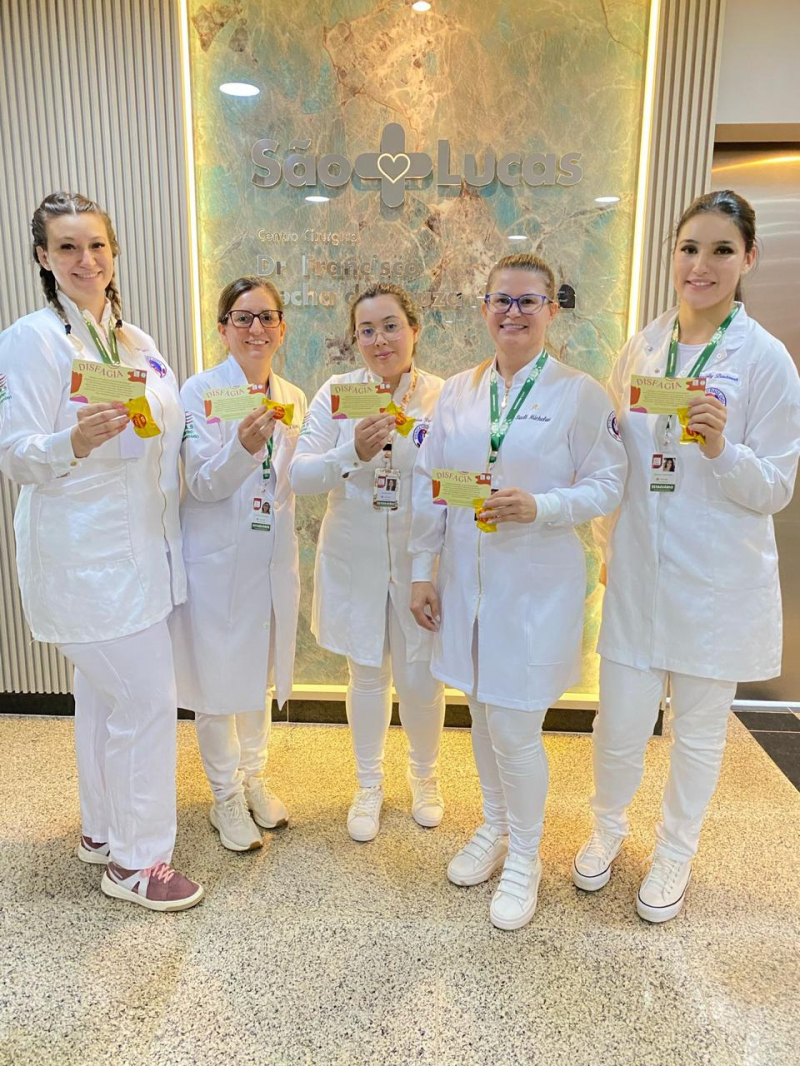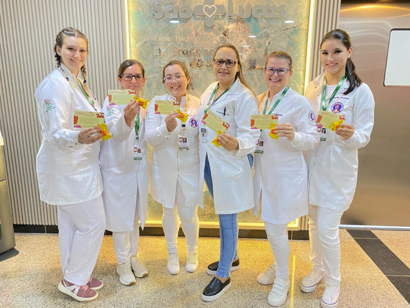 Acadêmicas do 7º período de Fonoaudiologia realizaram, entre 17 e 20 de março, a Semana de Atenção à Disfagia, promovendo atividades informativas para a comunidade. A ação ocorreu no Hospital São Lucas, onde pacientes internados, cuidadores, acompanhantes e a equipe assistencial receberam orientações sobre a disfagia – dificuldade em engolir alimentos, líquidos ou saliva.