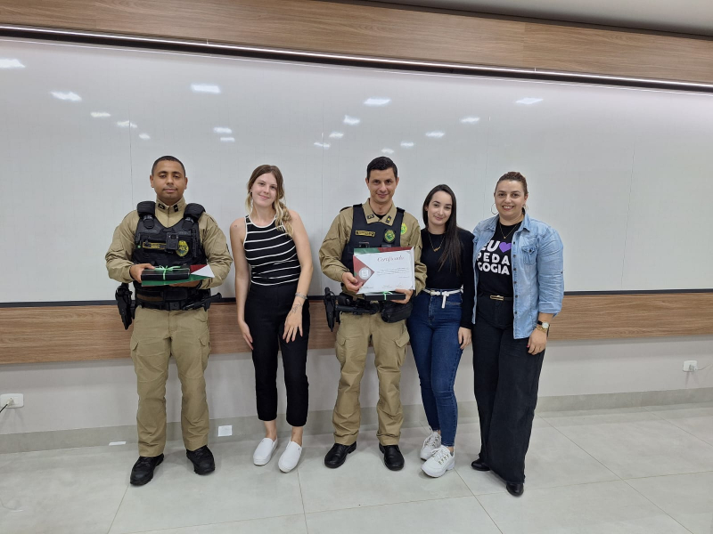 Na sexta-feira (11/04), os acadêmicos do curso de Pedagogia do Centro Universitário FAG participaram de uma palestra enriquecedora sobre a prevenção da violência no ambiente escolar. A atividade foi conduzida pela coordenadora Danieli Sanderson e pela professora Silvia Cavalheiro, com a participação especial do Soldado Teixeira e do Sargento Fernando, representantes da Patrulha Escolar.