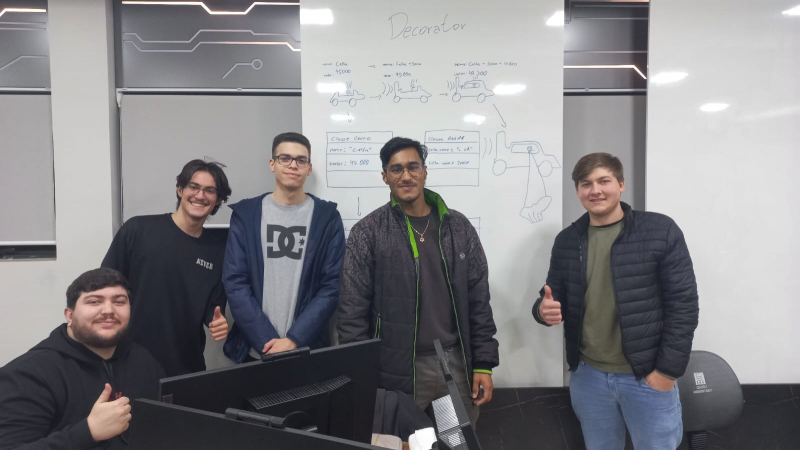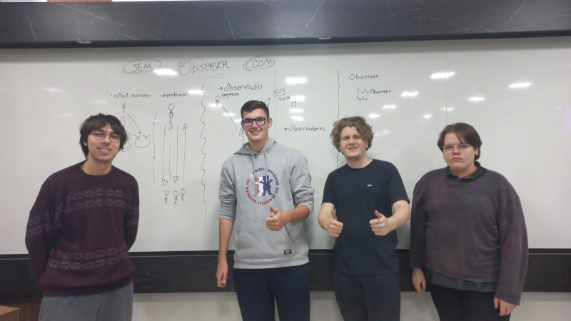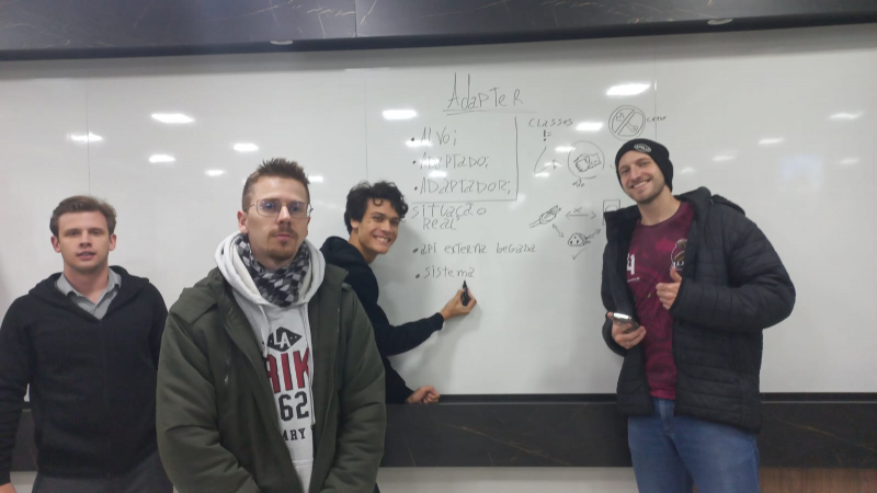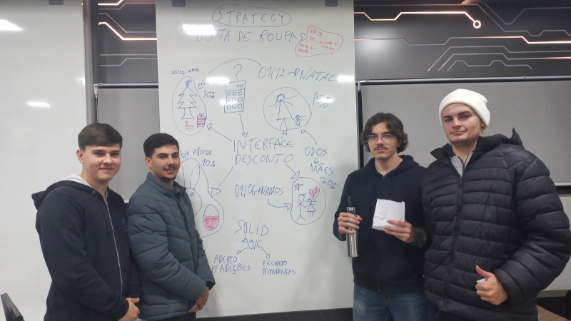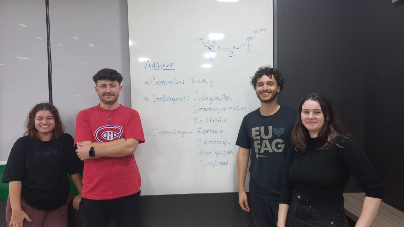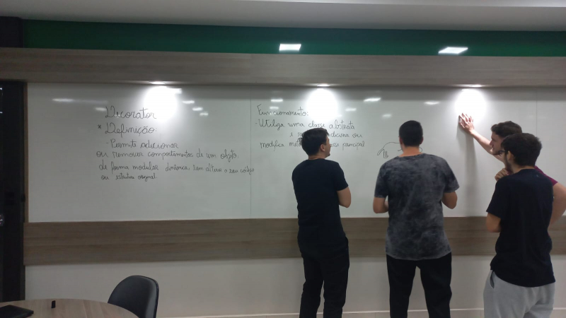 Em seguida, os grupos foram desafiados a preparar, com tempo limitado e utilizando os quadros laterais do laboratório como suporte, uma apresentação coletiva sobre um dos padrões escolhidos pelo professor, com o objetivo de ensinar o conceito para toda a turma de forma clara, técnica, dinâmica e didática.