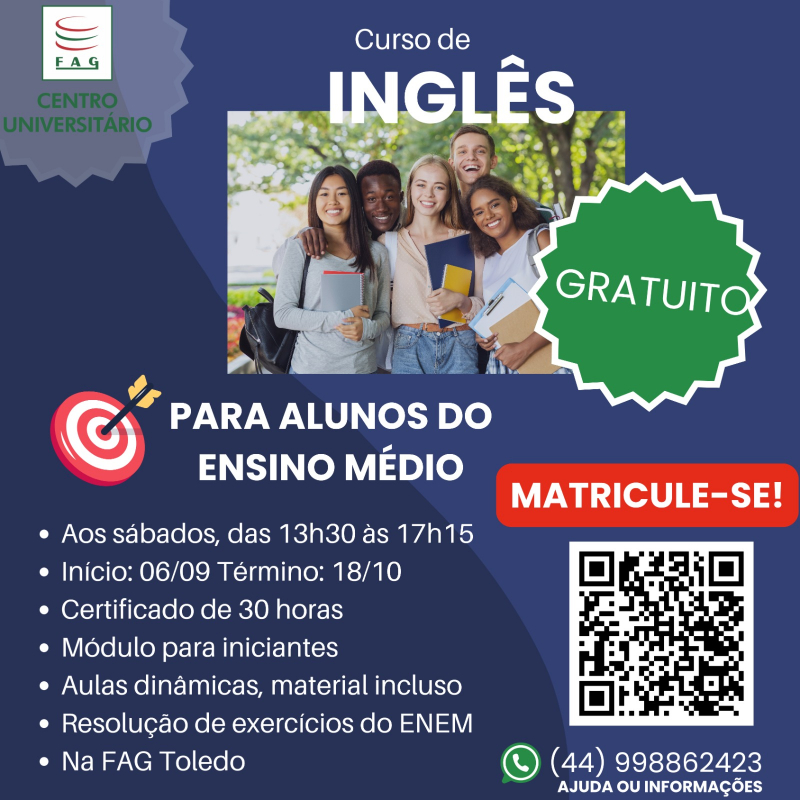 A FAG Toledo está com inscrições abertas para o curso gratuito de Inglês para iniciantes, organizado pelo colegiado de Letras Português/Inglês.
