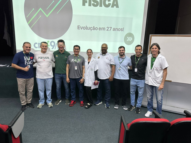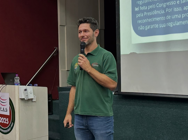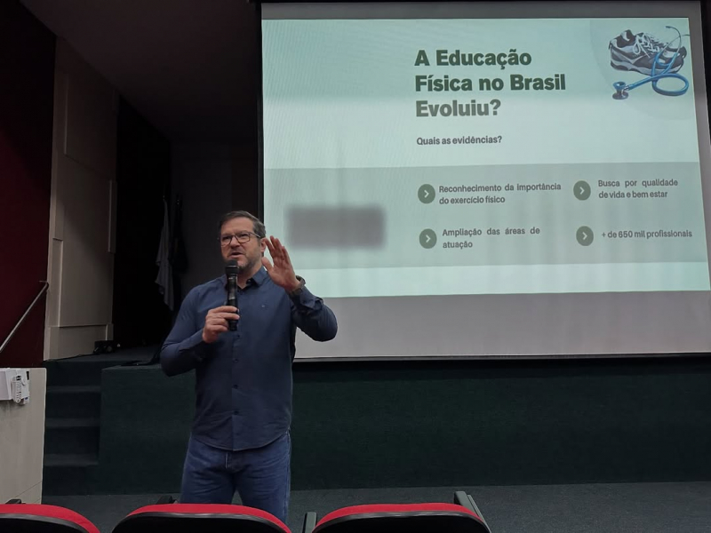 Pela manhã, os acadêmicos receberam o presidente do CREF9/PR, Prof. Gustavo Brandão, que ministrou a palestra “O CREF e a Valorização do Profissional de Educação Física”. O encontro abordou o papel do Conselho na regulamentação, defesa e reconhecimento da profissão, além de abrir espaço para diálogo com os estudantes.