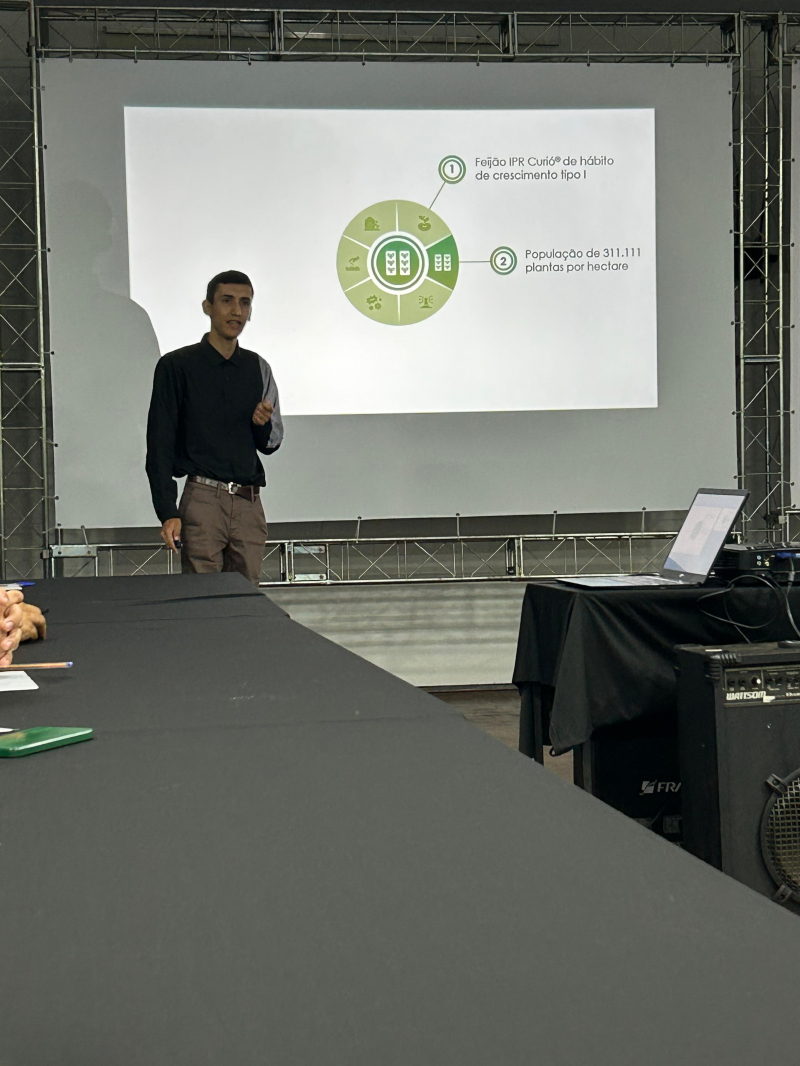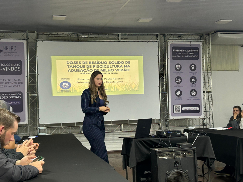A acadêmica Khauany Roecker, do 10º períodos, recebeu o título de melhor produção apresentada na noite. “Doses de resíduos sólidos de tanque de piscicultura na adubação de milho verão”, compartilhou sua experiência: “Foi uma experiência muito especial participar da noite de apresentações. Ganhar a competição tornou o momento ainda mais especial, representando um reconhecimento importante que me motiva a seguir pesquisando e aplicando práticas inovadoras no campo.”