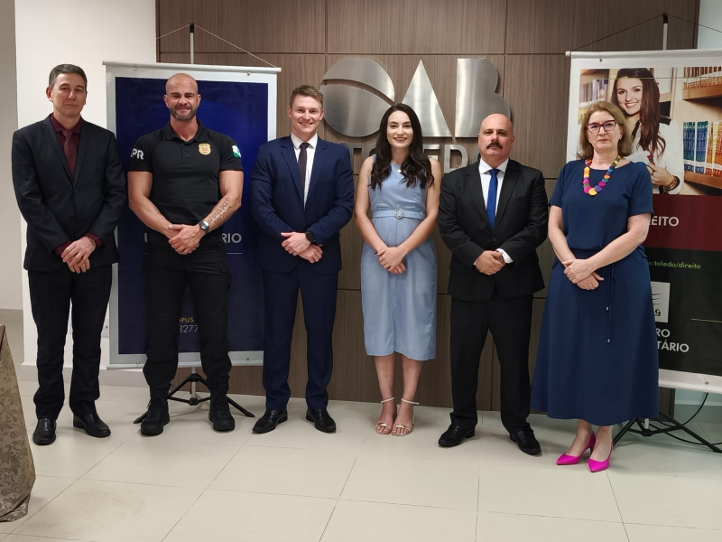 Na noite desta quarta-feira (15), o curso de Direito da FAG Toledo promoveu a Mostra de Profissões, realizada na sede da OAB – subseção de Toledo. O encontro de profissionais integrou a programação da Semana Jurídica 2025. A mostra contou com a presença do delegado da Polícia Civil do Paraná, Leandro Stabile. "Participar desta mostra é uma valorização do trabalho do delegado de polícia e da Polícia Civil como um todo. Ser reconhecida como uma carreira jurídica é um grande orgulho para mim, enquanto delegado, e para os colegas investigadores, que trabalham e se dedicam muito à profissão", afirmou. O juiz Silvio Bueno também foi convidado a compartilhar sua trajetória profissional. "Falar sobre esta carreira é também estimular os alunos a enxergarem um potencial profissional pela frente e perceberem que a carreira de juiz é possível e pode ser uma trajetória a seguir", comentou.