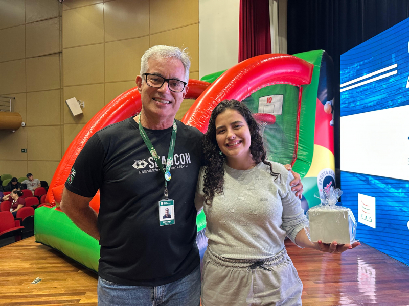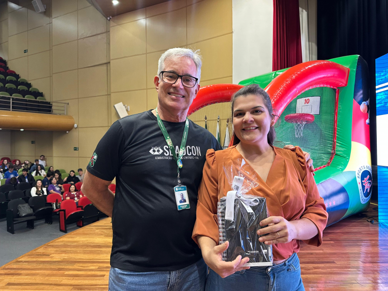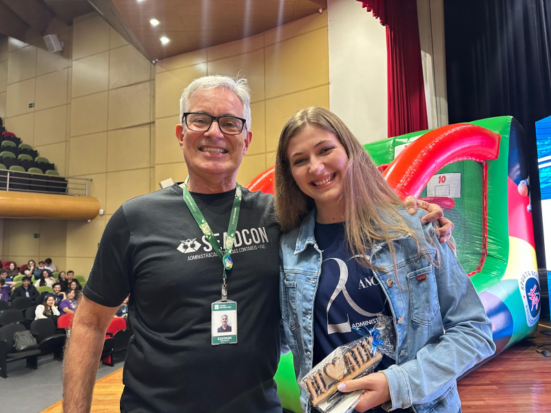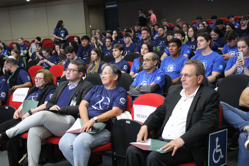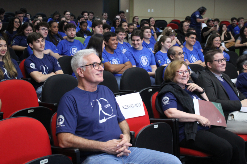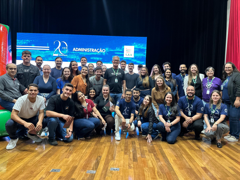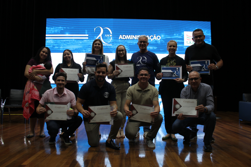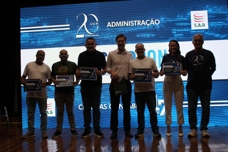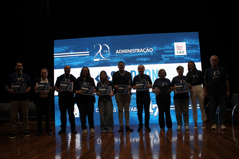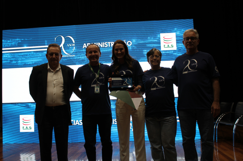 A abertura foi marcada por momentos de reconhecimento e emoção, com homenagens aos egressos que hoje atuam na FAG, aos professores e à pró-reitora de Ensino, Pesquisa, Extensão e Pós-Graduação, Aline Gurgacz Ferreira, em reconhecimento à sua contribuição para o fortalecimento e desenvolvimento do curso de Administração ao longo dos anos.