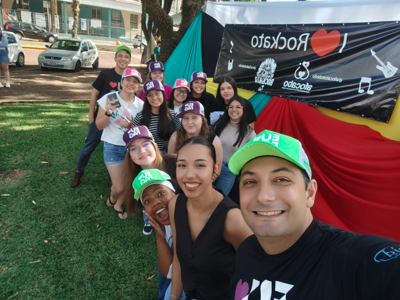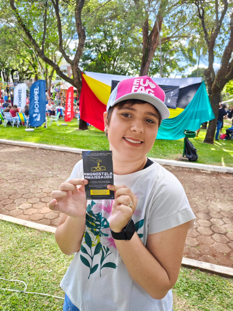 As acadêmicas do 2º período do curso de Pedagogia lançaram o projeto de extensão "Menos tela, mais saúde", durante o evento Rockato, realizado no último sábado (8), na Praça da Cultura. A ideia surgiu durante uma aula do professor Leandro Crestani. A turma foi desafiada a realizar uma atividade de conscientização sobre o excesso de telas entre as crianças, na disciplina de PROEX Educação e Tecnologia. Além da criação de uma logomarca para as redes sociais, as alunas também estão organizando uma campanha offline, com reportagem de rádio, material impresso e panfletagem voltada aos pais, alertando sobre os riscos do uso excessivo das telas para o desenvolvimento cognitivo infantil. "É um projeto proposto dentro da disciplina de PROEX, que desafia os acadêmicos a trazer essa problemática à tona, conscientizando, por meio das mídias tradicionais e offline, os pais de crianças expostas a horas de telas diariamente. É necessário trazer essa temática para o campo da educação de forma urgente, promovendo a conscientização sobre o uso responsável dos aparelhos e tecnologias, bem como o controle para evitar exageros que possam comprometer o desenvolvimento das crianças", explica o professor Leandro Crestani.