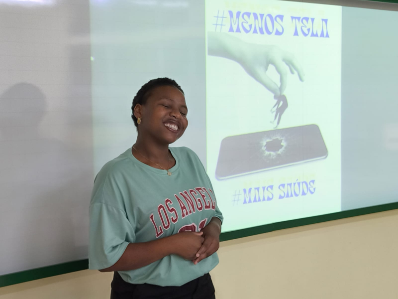 No material de divulgação preparado pelas alunas, são apresentados dados sobre transtornos posturais, problemas visuais, perda auditiva causada pelo uso de fones de ouvido, isolamento social, baixa autoestima e redução da atenção e da concentração, especialmente entre crianças em idade escolar. Fatores que impactam o aprendizado e o desempenho dos alunos. O conteúdo também aborda comportamentos compulsivos e dependência digital, estimulados por jogos e redes sociais que utilizam mecanismos de recompensa cerebral baseados na dopamina, os quais geram sensação de prazer imediato e vício, citando pesquisa da pediatra Maria Souza. "O cérebro infantil precisa de movimento, toque e interação real e isso a tela não oferece. Os primeiros mil dias de vida são fundamentais para o desenvolvimento cerebral e emocional da criança, já que, nesse período, a presença dos pais é insubstituível. São eles que fortalecem o vínculo afetivo e promovem a segurança emocional. Dessa forma, crianças que passam longos períodos em frente à tela têm mais dificuldade em lidar com frustrações e desenvolver autonomia emocional", alerta.