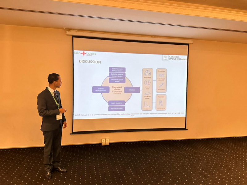 Maycon submeteu uma apresentação oral e um pôster. O trabalho intitulado “Epidemiological profile of diabetic patients with infections hospitalized in a teaching hospital in the West of Paraná – Brazil” foi apresentado no palco principal do congresso, enquanto o pôster “Experience report: Establishment of an academic league of scientific research and its impact on medical and scientific training in a medical school in Brazil” destacou a criação da primeira liga acadêmica de pesquisa científica do Paraná, fundada pelo próprio estudante.