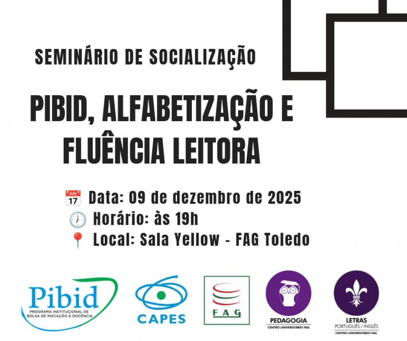 A FAG Toledo está com inscrições abertas para o Seminário de Socialização do Programa Institucional de Bolsa de Iniciação à Docência (PIBID), que acontecerá na sala Yellow de metodologias ativas, no dia 9 de dezembro. No encontro (PIBID, alfabetização e fluência leitora), serão apresentados relatos de experiência do PIBID nas Escolas-Campo, evidenciando práticas de alfabetização e fluência leitora nos anos iniciais do Ensino Fundamental, desenvolvidas pelos acadêmicos bolsistas (Pibidianos) da FAG Toledo em parceria com as escolas da rede municipal. A mediação do seminário será realizada pelo professor doutor Leandro Crestani. Também haverá a explanação das professoras convidadas: Luci Graciela Kuhn, da Escola Municipal Jardim Concórdia; Alessandra Paula Neves de Oliveira, da Escola Municipal Eng. Waldyr Luiz Becker e Vilma de Oliveira Santos, da Escola Municipal Vereador José Pedro Brum (CAIC).