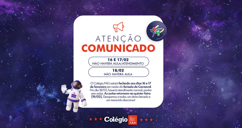 O Colégio FAG informa que estará fechado nos dias 16 e 17 de fevereiro em razão do feriado de Carnaval. Retornaremos aos atendimentos na quarta-feira (18) e as aulas na quinta-feira (19).