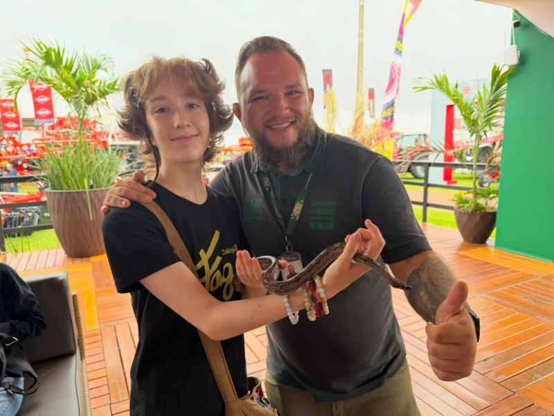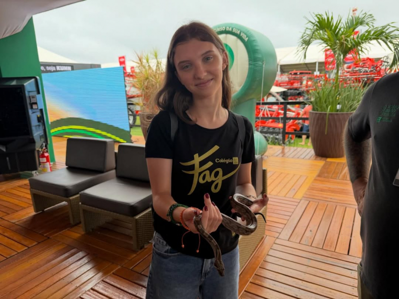 Durante a visita, os alunos também participaram das atividades promovidas no estande do Centro Universitário FAG. Miguel Augusto, da 2ª série B, destaca que gostou de conhecer a Jiji, a Jibóia da instituição. “Acho muito legal essa experiência que a FAG está proporcionando para a gente”, comenta.