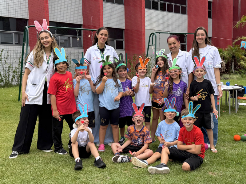 A dinâmica de caça aos ovos é um momento tradicional e muito aguardado pelas crianças. Neste ano, a brincadeira ocorreu no Parque dos Ipês e estimulou o trabalho em equipe e o olhar afiado dos estudantes. Ao fim, a turma dividiu os ovos de chocolate encontrados.