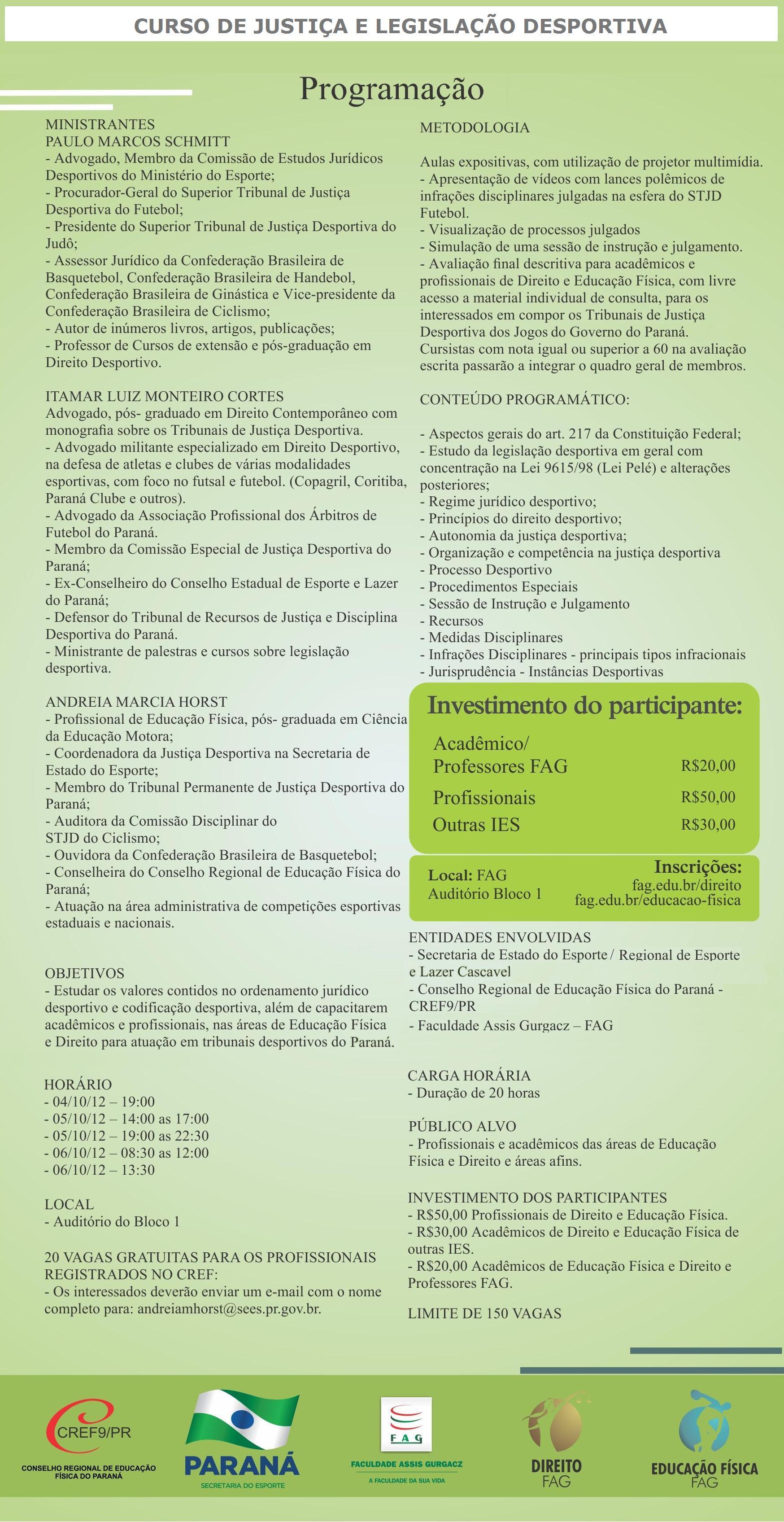"Justiça e Legislação Desportiva" esse é o tema do curso promovido pelas graduações de Direito e Educação Física da Faculdade Assis Gurgacz. A atividade começa nesta quinta-feira (4), às 19h, no Auditório do Bloco 01. Entre os palestrantes está Paulo Marcos Schmitt: membro da Comissão de Estudos Jurídicos Desportivos do Ministério do Esporte; procurador-geral do Superior Tribunal de Justiça Desportiva do Futebol; presidente do Superior Tribunal de Justiça Desportiva do Judô; assessor jurídico das Confederações Brasileiras de Basquetebol, Handebol, e Ginástica; além de vice-presidente da Confederação Brasileira de Ciclismo. Ao fim do evento, profissionais e alunos passam por uma avaliação. Aqueles que alcançarem nota maior ou igual a 60 pontos passam a integrar o quadro geral de membros do Tribunal Desportivo dos Jogos Oficiais do Paraná. Inscrições O investimento é de R$ 20 para acadêmicos e professores da FAG, R$ 30 para alunos e docentes de outras instituições e R$ 50 para profissionais. Visualize a programação completa e faça sua inscrição aqui. Outras informações no 3321-3977 e 3321-3946.