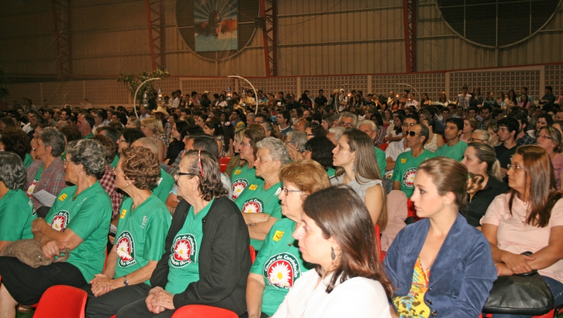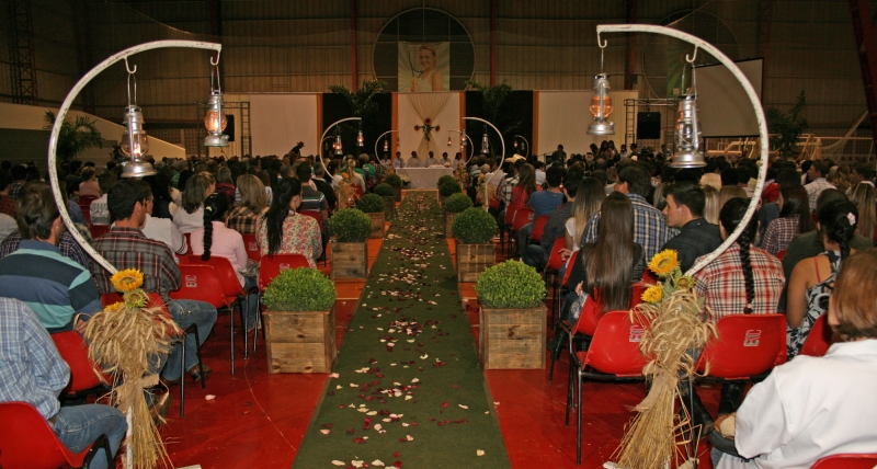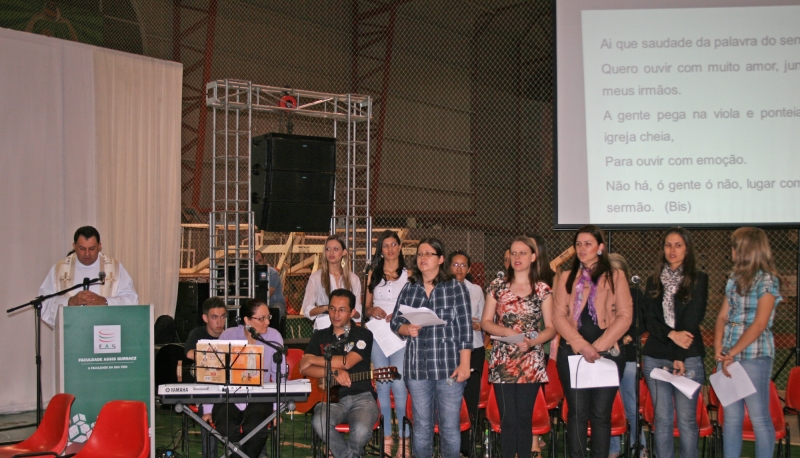 A homenagem ao padroeiro da Fundação Assis Gurgacz, São Francisco de Assis, começou ao som do berrante. A 1ª Missa Sertaneja aconteceu ontem (04), no Ginásio de Esportes e reuniu mais de 1000 acadêmicos, professores e familiares. A ação também celebrou o dia do Médico Veterinário e do Agrônomo. Os idosos da Ação Integrada pela Cidadania também participaram da celebração. "É um prazer ver meus velhinhos interagindo com os acadêmicos. Nosso objetivo foi celebrar e agradecer todas as bênçãos", destaca a presidente da Fundação Assis Gurgacz, Nair Ventorin Gurgacz. A coordenadora adjunta do curso de Agronomia, professora Ana Paula Simonetti, falou da homenagem aos alunos. "Essa foi a forma que escolhemos para celebrar o Dia do Agrônomo. Todos os alunos participaram e trouxerem seus familiares", destaca a professora. Salete Chrun, coordenadora de Ação Social, aproveitou para agradecer o envolvimento de todos os colegiados. "Esse foi um trabalho conjunto, entre as coordenações de Agronomia, Veterinária e a Ação Social. Quero agradecer o envolvimento de todos e destacar que esta celebração já está em nosso calendário, por isso deve acontecer todos os anos", finaliza.