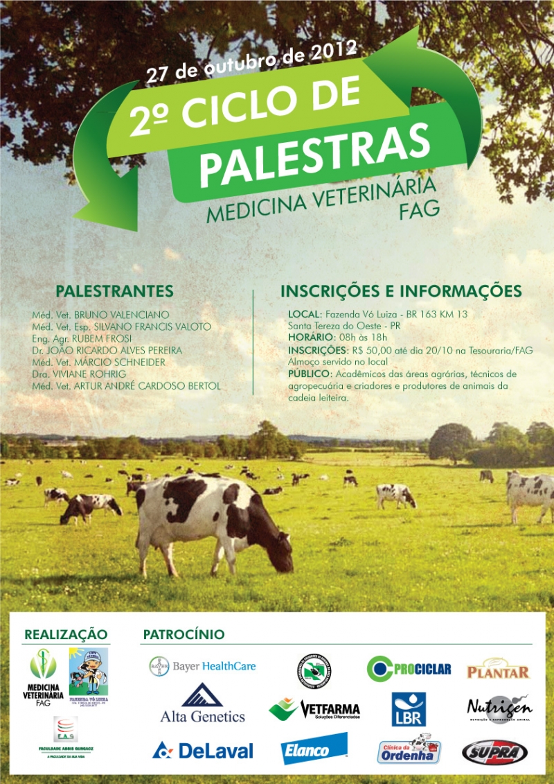 O curso de Medicina Veterinária promove o 2º Ciclo de Palestras. Será neste sábado (26), na Fazenda Vó Luiza (BR 163 - km 13), em Santa Tereza do Oeste. A atividade acontece durante todo o dia, das 8h às 18h, e é direcionada aos acadêmicos das áreas agrárias, técnicos de agropecuária, e criadores e produtores de animais da cadeia leiteira. Ao todo, sete profissionais ministram as palestras. Outras informações no (45) 3321-3924.