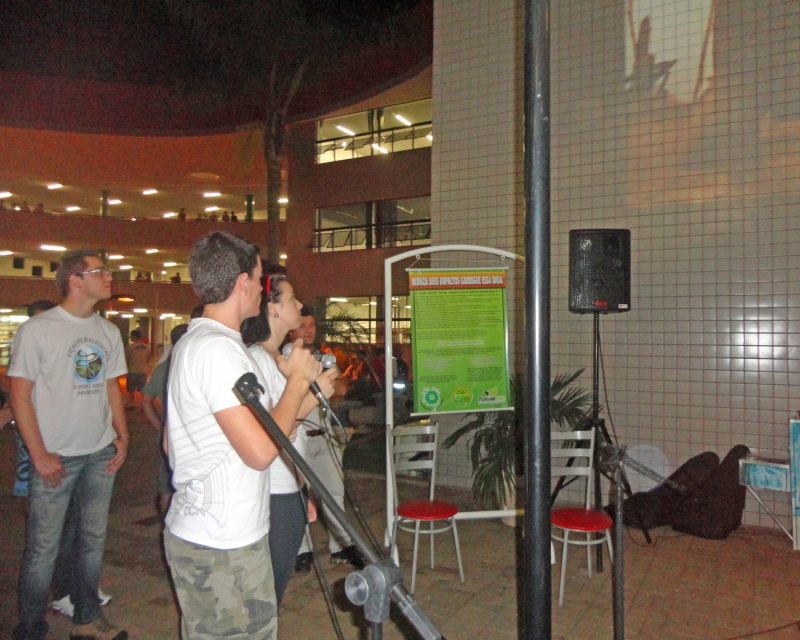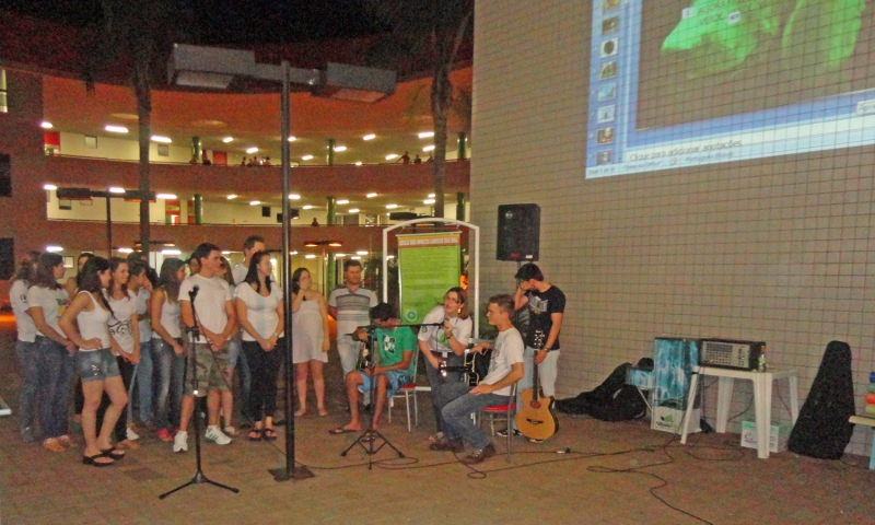 Este mês, os alunos do 6º período de Ciências Biológicas, animaram os estudantes que passara pelo Bloco 2. O projeto "Cantando Verde" foi desenvolvido como prática na disciplina de Educação Ambiental, ministrada pela professora Iara Cardoso. No repertório Falamansa e Munhoz e Mariano. Depois das canções, os estudantes apresentaram um vídeo da música Earth Song, de Michael Jackson, e os acadêmicos, Luciano e Roberta, interpretaram a tradução. "Toda a atividade foi direcionada à questão de sensibilização ambiental, para que possamos ter boas ações perante o meio ambiente e mudança de valores no cotidiano dos nossos alunos", enfatiza a professora. Ao fim da apresentação, foi aplicado um questionário, sobre as ações de cada um perante o meio ambiente.