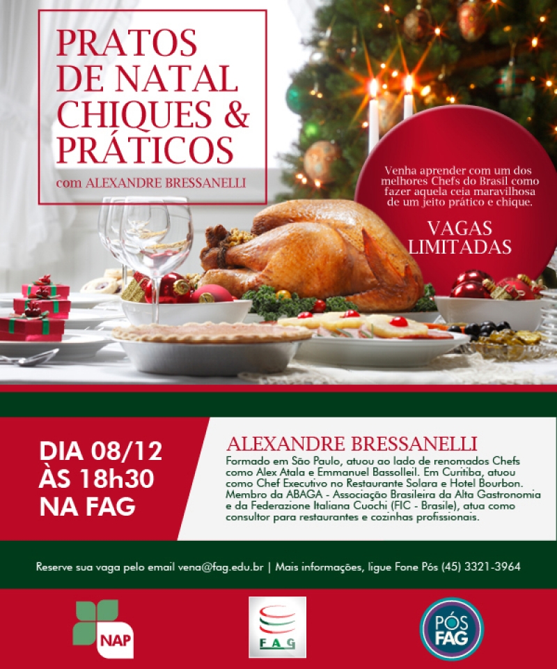 O renomado chef de cuisine, Alexandre Bressanelli, ministra mais um curso na FAG, desta vez para ensinar Pratos de Natal, chiques e práticos. Será no dia 8 de dezembro, às 18h30, no laboratório de Nutrição (Bloco 4). As vagas são limitadas e as inscrições podem ser feitas pelo e-mail [email protected]. Mais informações no (45) 3321-3964. A atividade é promovida pelo Núcleo de Aperfeiçoamento Profissional (NAP). Sobre o Chef Formado em São Paulo, atuou ao lado de renomados chefs como Alex Atala (Restaurante Filomena) e Emmanuel Bassolleil (Restaurante Roanne). Em Curitiba, atuou como chef executivo no restaurante Solara e Hotel Bourbon. Membro da ABAGA - Associação Brasileira da Alta Gastronomia e da Federazione Italiana Cuochi (FIC - Brasile), atua como consultor para restaurantes e cozinhas profissionais.
