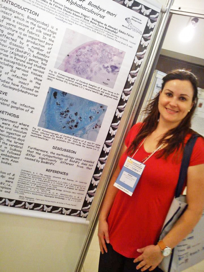 A professora Jéssica Vencatto Senem, do curso de Ciências Biológicas, levou o nome da FAG a três eventos internacionais nesse semestre, que renderam publicações. O XXIII Congresso Brasileiro de Virologia, VII Encontro de Virologia do Mercosul; Simpósio Sul Brasileiro de Microscopia e Microanálise e III Simpósio de Ciências Aplicadas à Sericicultura; e I Encontro Latino-Americano de Pesquisadores da Cadeia da Seda, foram o palco para publicação e apresentação dos trabalhos: "Cerebral Ganglion of Bombyx mori infected by Alphabaculovirus", "Bombyx mori Malpighian Tubules are not infected by Alphabaculovirus", "Técnica de coloração de azul de metileno no gânglio cerebral de Bombyx mori". "Fico satisfeita, contente e com a sensação de dever cumprido ao poder realizar essas participações e publicações que contribuem para o crescimento em qualidade da nossa instituição. Além disso, conhecer o que está sendo feito pelo mundo afora, me faz retornar fortalecida e com novos horizontes a serem vislumbrados para futuros trabalhos", enfatiza a professora. Atividades faz parte do Núcleo de Relações Internacionais (NRI).