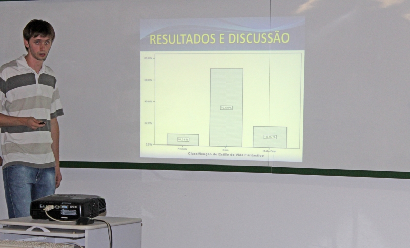 Durante uma semana os alunos do 8º período do curso de Educação Física ? Bacharelado, apresentaram seus Trabalhos de Conclusão de Curso. Foram 35 projetos que mostraram à banca avaliadora a análise dos dados coletados em campo, pelos acadêmicos. Os estudantes Carlos Eduardo e Franciele Oliveira escolheram estudar a força dos membros superiores e inferiores de idosos que praticam atividades aquáticas. "O TCC serviu para apresentar à comunidade acadêmica o resultado da pesquisa, desenvolvida por dois anos?, conta Carlos. Mas a dupla não apresentou apenas para a banca e colegas, eles também levaram os pais e irmãos. ?Minha mãe estava mais nervosa que eu", brinca.