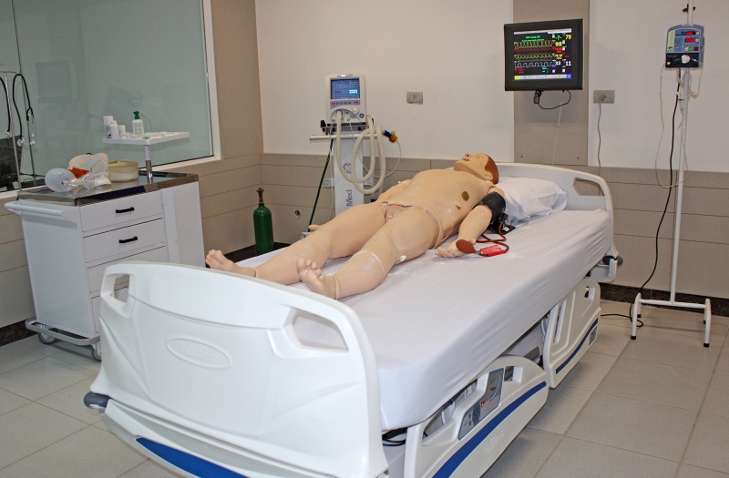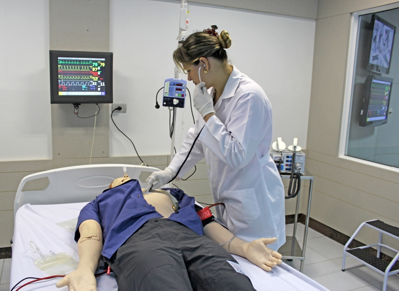 No espaço os alunos podem simular o atendimento a um paciente, usando um modelo didático