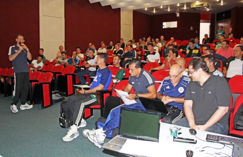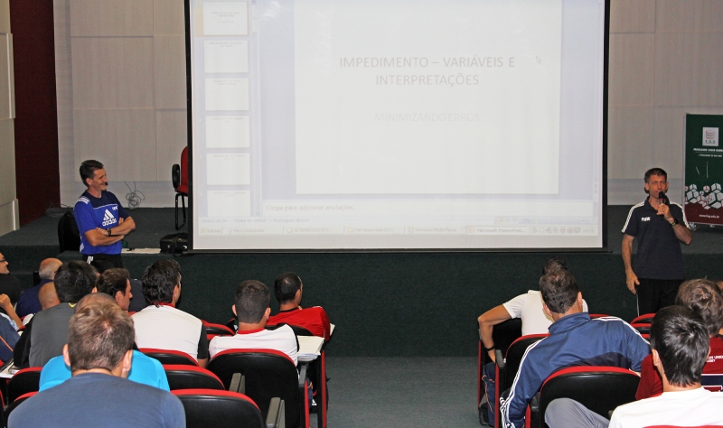 Hoje (17), no período da manhã, árbitros e assistentes da Federação Paranaense de Futebol participaram de três palestras. A atividade faz parte da Pré-temporada e segue até sexta-feira (18). A primeira aula foi sobre regulamento e estatuto do torcedor, ministrada pelo advogado e especialista em direito desportivo, Juliano Bozzano. Na sequência, Altemir Hausmann, que já apitou mais de 800 jogos, incluindo dez Libertadores e duas Copas do Mundo, falou sobre aprimoramento do árbitro assistente. Para finalizar as atividades da manhã, o assistente FIFA e instrutor da Federação Paraguaia, Manoel Bernal, comentou sobre aplicação de vídeo teste e também a participação do árbitro assistente no impedimento. Na parte da tarde, árbitros e assistentes seguem para o trabalho em campo.