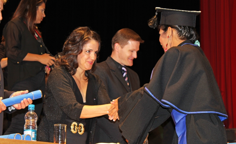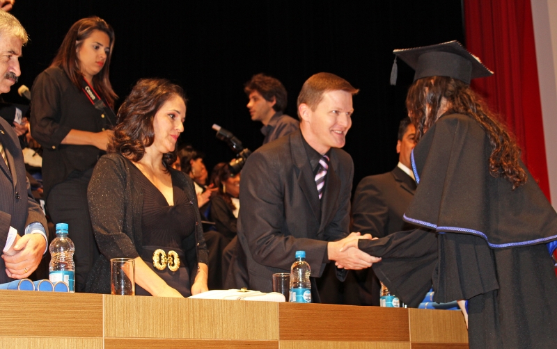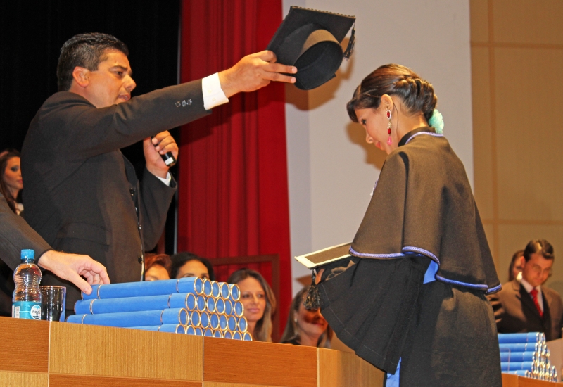 A última semana foi movimentada no campus da FAG. Mais seis turmas colaram grau entre quinta (24) e sexta-feira (25), no Anfiteatro da Reitoria. São 160 novos profissionais. Todas as solenidades foram presididas pelo diretor acadêmico, professor Afonso Cavalheiro Neto. Na quinta-feira (24) foi a vez dos formandos de Educação Física Bacharela - turmas 01 e 02, Fonoaudiologia e Letras. Os alunos de Educação Física, turma 01, escolheram como paraninfo o coordenador do curso, professor Vitor Cesar Moreira. O patrono foi o professor Everton Roman. O escolhido como nome de turma foi Roberto Regis Ribeiro. A turma de Fonoaudiologia escolheu a professora Jenane Topanotti da Cunha, como paraninfa. A professora Aline Aparecida Tomiasi, foi a patronesse. A homenageada como nome de turma foi a professora Franciele Savaris Soria. Ainda na quinta-feira, a turma Débora Dorst, do curso de Educação Física Bacharelado 02, escolheu o professor Everton Roman, como paraninfo. O coordenador Vitor Cesar Moreira, foi o patrono. Os estudantes de Letras escolheram como paraninfa a professora Patrícia de Lara Ramos e como patronesse a professora Patrícia Radaelli. O nome de turma foi o coordenador do curso, Paulo Fachin. Na sexta-feira (25), os formandos de Pedagogia escolheram a professora Marilena Salvatti como paraninfa. O patrono foi o professor Emilio Mortini e o nome de turma a professora Salete Chrun. Já a turma Juliana de Andrade Vilas Boas, de Psicologia, escolheu a professora Graziele Bueno de Farias para paraninfa e a professora Dirleia Sbardelotto como patronesse. O grupo também homenageou a professora Julise Alves Dornelles Savalha.