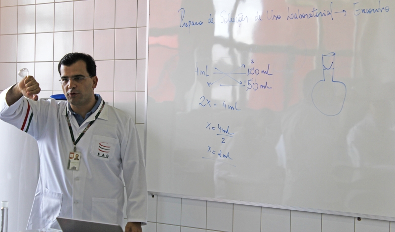 A Faculdade Assis Gurgacz promoveu na última sexta-feira (15), o 1° módulo do curso de Preparo em Soluções de Uso Laboratorial, direcionado aos colaboradores dos Laboratórios. O objetivo é capacitar, tirar dúvidas e ampliar os conhecimentos dos funcionários para que possam auxiliar professores e alunos. Ao todo serão 10 encontros, todos ministrados pelo farmacêutico e bioquímico, Claudinei Mesquita da Silva. Os encontros acontecem no Laboratório de Química, no Bloco 1. Módulos, em outras áreas, já estão programados.