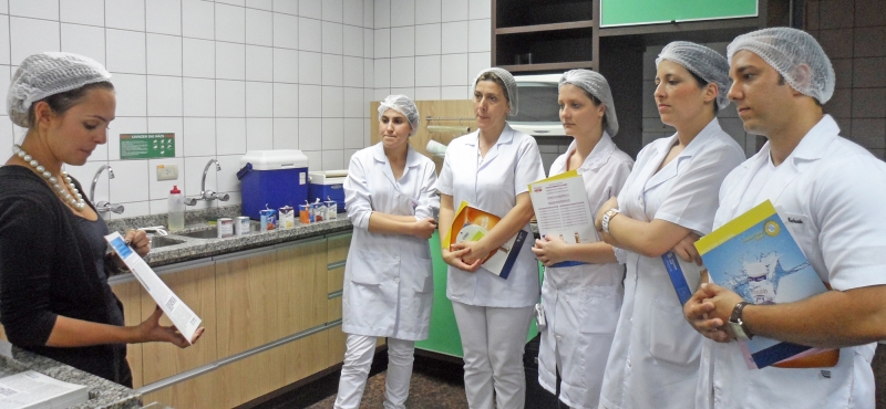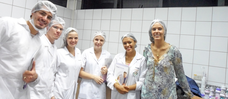 O curso de Nutrição recebeu as egressas Dalila Trevisan, Karla Vacarin, Monia Trombim e Julyana Soares para uma aula prática. As profissionais atuam na área de Marketing dos quatro maiores laboratórios de suplementos e dieta enteral do país, Nestle Nutrition, Abbott, Fresenius Kabi e Support. Os alunos do 5º período conheceram e degustaram os suplementos, que estão disponíveis no mercado, orientados pelas representantes de cada laboratório. A atividade foi desenvolvida na disciplina de Fisiopatologia e Dietoterapia, ministrada pela professora Raquel Goreti Eckert. Para a coordenadora do curso, Nanci Rouse Teruel Berto, a prática proporcionou a troca de experiências entre alunos e egressas. "É motivo de orgulho para a instituição, ter como egressas profissionais do mais alto gabarito. Ao retornar à instituição elas repassam um pouco do que aprenderam aos futuros profissionais", comenta Nanci.