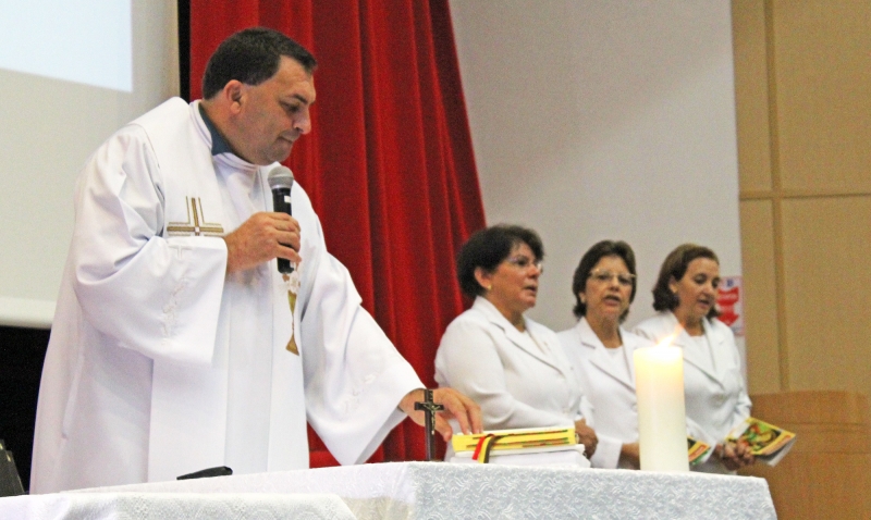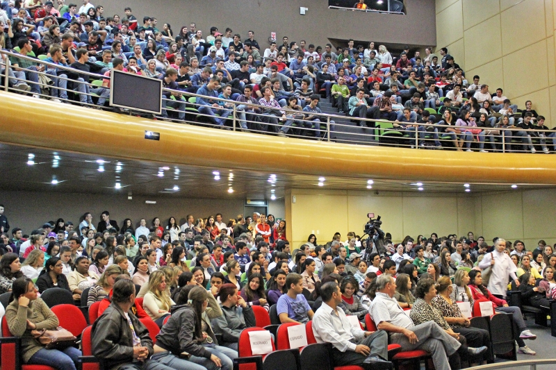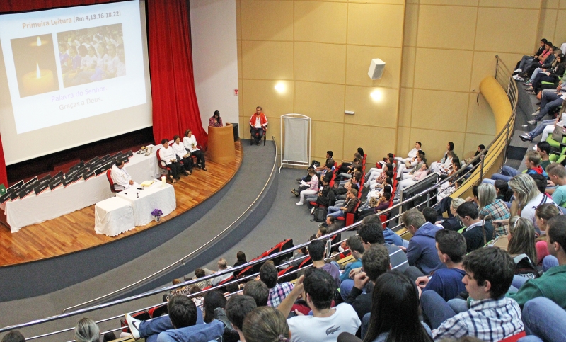 Como parte do trabalho desenvolvido pela Pastoral Universitária, a FAG recebeu, na noite de ontem (19), uma missa. Calouros de todos os cursos, acompanhados dos coordenadores e professores, lotaram o Anfiteatro da Reitoria para a cerimônia, celebrada pelo padre Sandro Cortez, em ação de graças ao início do ano letivo. O presidente da FAG Assis Gurgacz, a vice-presidente Nair Ventorin Gurgacz, a diretora administrativa Jaqueline Gurgacz, o diretor geral Sérgio de Angelis, e o diretor acadêmico, professor Afonso Cavalheiro Neto, também participaram da celebração. A missa começou com os acadêmicos levando ao altar uma placa com o nome do seu curso. Fernanda Paula Oliveira, do 1º período de Fonoaudiologia, e André Luiz, do 1º período de Arquitetura e Urbanismo, fizeram parte do Coral.
