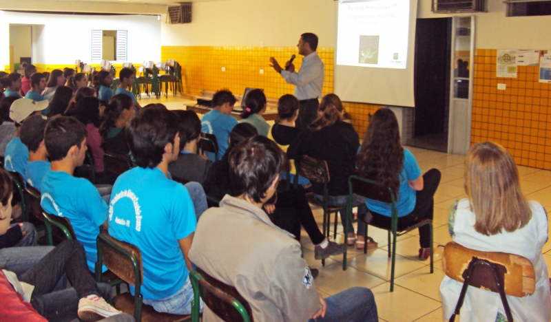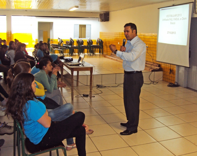 O diretor geral da FAG, professor Sérgio de Angelis, ministrou uma palestra no Colégio Estadual Humberto de Alencar Castelo Branco, em Jesuítas, para os alunos do Ensino Fundamental, Médio e Profissional. Ao todo, 200 estudantes participaram da atividade, com o tema "Escolha Profissional". "O ensino médio é hora de o aluno escolher sua profissão e nesse momento, por muitas circunstâncias, os estudantes são pressionados pelos professores, amigos e familiares, e acabam confusos. Por isso nosso objetivo é mostrar que a FAG está a disposição para auxiliar, abrindo as portas da instituição para que o estudante participe das atividades que tenha interesse, como forma de conhecer e trocar experiências com alunos e professores", explica o diretor. A ação está à disposição para outros colégios. Aos interessados, o agendamento pode ser feito através do e-mail: [email protected].
