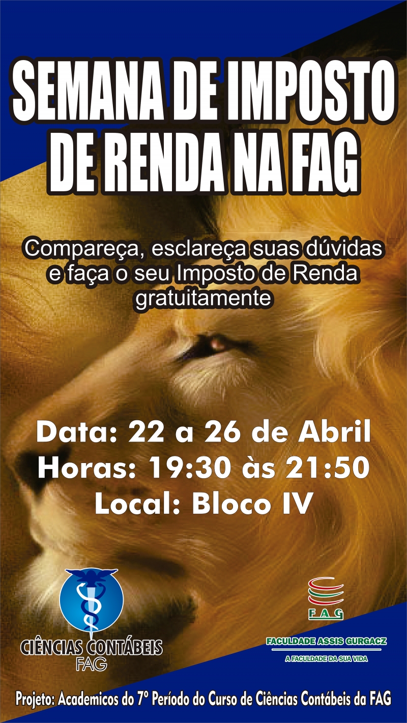 Começa na segunda-feira (22) a 3º Semana do Imposto de Renda na FAG. As declarações serão feitas pelos acadêmicos do 7º período, sem custo, para alunos, funcionários da FAG e Dom Bosco, e comunidade externa. Será das 19h30 às 21h50, na área de convivência do Bloco 04. A ação segue até sexta-feira (26). Os serão supervisionados pela professora Suzana Burin, que também estará auxiliando e conferindo as atividades executadas. Abaixo, a lista de documentos necessários e de alguns comprovantes que podem ser exigidos. 1) RG 2) CPF 3) Título de eleitor 4) Comprovante de endereço 5) Documento ou anotação com sua profissão 6) Cartão do banco 7) Comprovantes (cópia da declaração do IR 2011; informes de rendimentos de instituições financeiras; relação de compra e venda de ações; informe de rendimentos de salários, distribuição de lucros, aluguéis e outras fontes de renda; outras rendas recebidas em 2011, como herança, doações, indenização por ação, resgate do FGTS; recibos de venda ou compra de bens, como carros e imóveis, ocorridos em 2011; documentos da aquisição de dívidas ou empréstimos em 2011; recibos de pagamentos de planos de saúde (informar CNPJ do convênio); recibos de despesas com educação (informar o CNPJ); recibo de despesas médicas e odontológicos (informar o CNPJ); comprovante de pagamentos de previdência social e privada (informar o CNPJ); comprovante de doações realizadas; recibos de empregada doméstica (informar o NIT); comprovante de recebimento de recursos da Nota Fiscal Paulista (para moradores de São Paulo)).