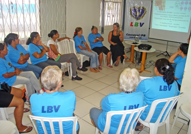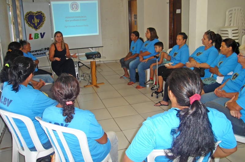 O curso de Fonoaudiologia promoveu uma palestra sobre a importância do profissional fonoaudiólogo na sociedade para o grupo de mães da Legião da Boa Vontade (LBV), em Cascavel. Na ação, foram apresentadas as principais atuações do fonoaudiólogo considerando as situações de dificuldade de fala nas crianças, problemas de audição, doenças que podem comprometer a memória, a comunicação e o tratamento das pessoas com problemas de voz. Para Giovana Romero Paula, coordenadora do curso, essas ações contribuem para o crescimento do futuro fonoaudiólogo. "Essas atividades são uma forma de divulgar o trabalho do profissional, contribuindo, de forma mais específica, para uma melhor qualidade de vida", conta.
