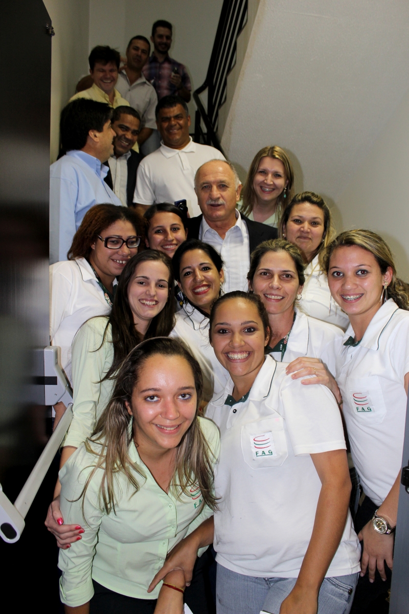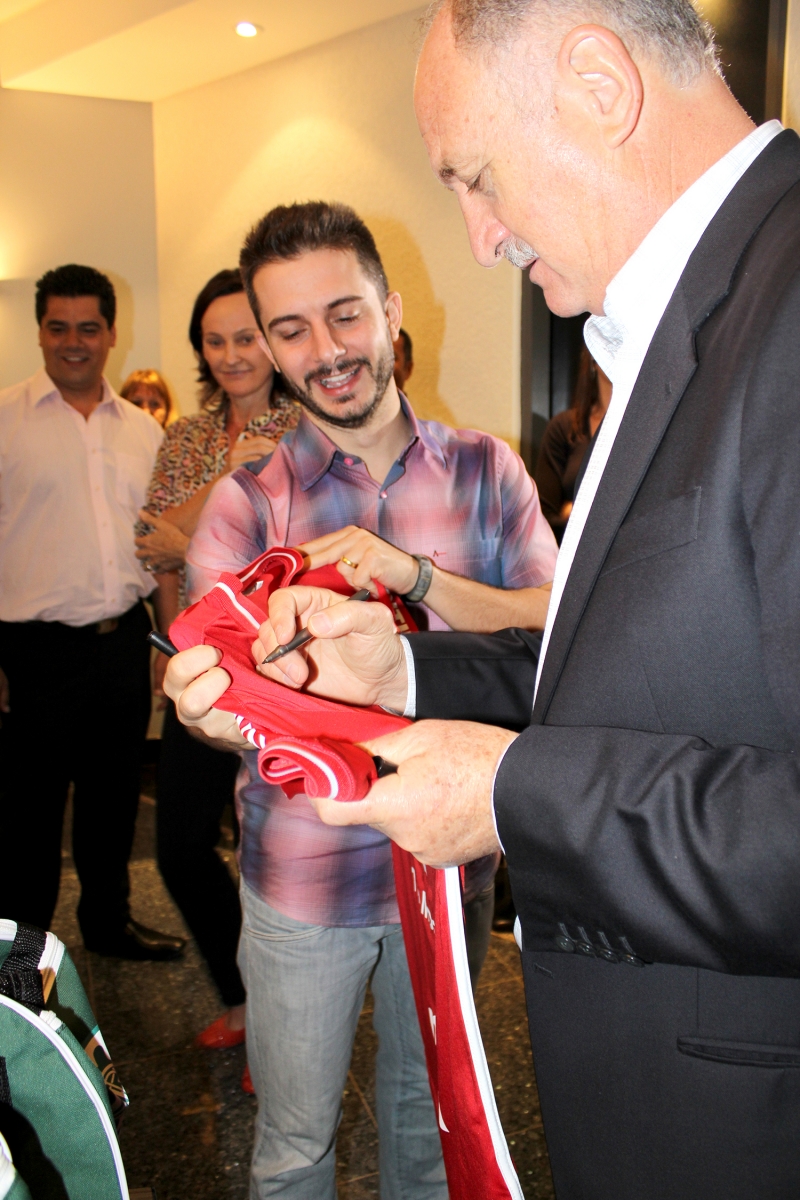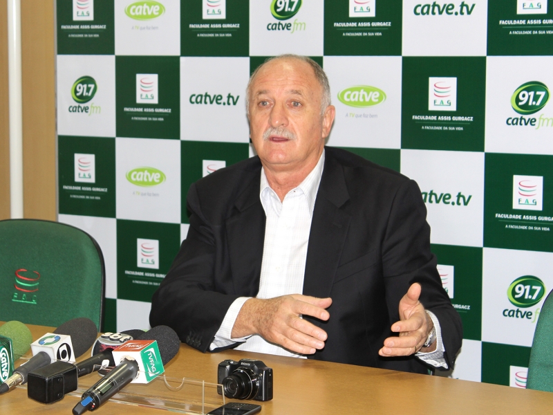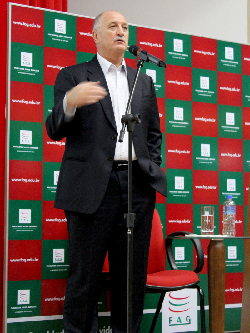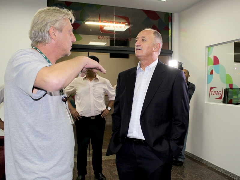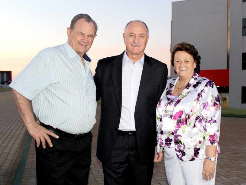 Com o tema "Caminhos e Conquistas", Luiz Felipe Scolari, técnico da Seleção Brasileira de Futebol, começou sua palestra contando suas primeiras experiências profissionais. Mais de 900 pessoas lotaram o Anfiteatro da Reitoria. Ao chegar a faculdade, Felipão recebeu uma homenagem do instituidor da FAG, Assis Gurgacz e da presidente da Fundação, Nair Ventorin Gurgacz. "É uma honra recebê-lo em nossa casa. Seja muito bem vindo. Será um prazer poder ajudar um amigo em comum", comentou Assis Gurgacz, referindo-se a Edgar Schmidt, já que toda verba arrecadada na palestra e no jantar será revertida ao comentarista gaúcho, que sofreu um AVC (Acidente Vascular Cerebral), em janeiro. Também participaram da cerimônia, o diretor geral, professor Sérgio de Angelis, o diretor acadêmico, professor Afonso Cavalheiro Neto, o coordenador do curso de Educação Física, Vitor César Moreira, e o diretor do grupo Catve, Jorge Guirado. Felipão elogiou o campus da FAG. "São poucas as faculdades que disponibilizam aos seus alunos um bosque, comum em universidades do exterior. Estou muito bem impressionado com toda essa estrutura", destacou. TV FAG Em seguida, o técnico da Seleção, conversou com a acadêmica do curso de Jornalismo e repórter da TV FAG, Adriana Ibba. Para o programa FAG Entrevista, Felipão falou sobre sua carreia e deu um recado. "Nosso principal objetivo é que todos tratem a Seleção como nossa Seleção e não a Seleção brasileira", destacou. Scolari, também conversou com os jornalistas de Cascavel e Região, em uma Coletiva de Imprensa.