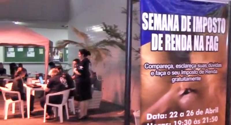 Os acadêmicos do 7º período do curso de Ciências Contábeis promoveram mais uma edição da "Semana do IR na FAG". Na atividade os alunos ofereceram declaração do Imposto de Renda gratuita à alunos, funcionários e familiares. A estrutura para atendimento ao público foi montada na área de convivência do Bloco 4. Ação foi coordenada pela professora Suzana Borin, em parceria com os professores Rildo do Nascimento e Nicéia Piasecki e resultou no atendimento de mais de 100 pessoas. "É uma boa oportunidade para treiná-los, capacitá-los para o mercado, além de funcionar como uma ação social", analisa Suzana.