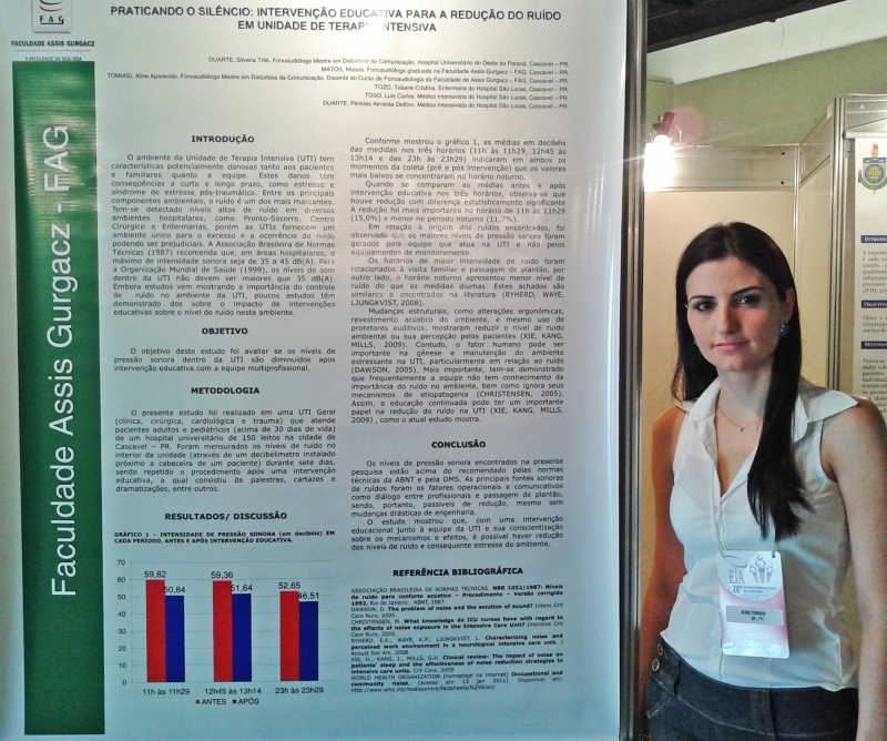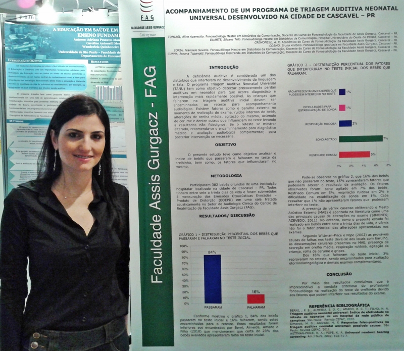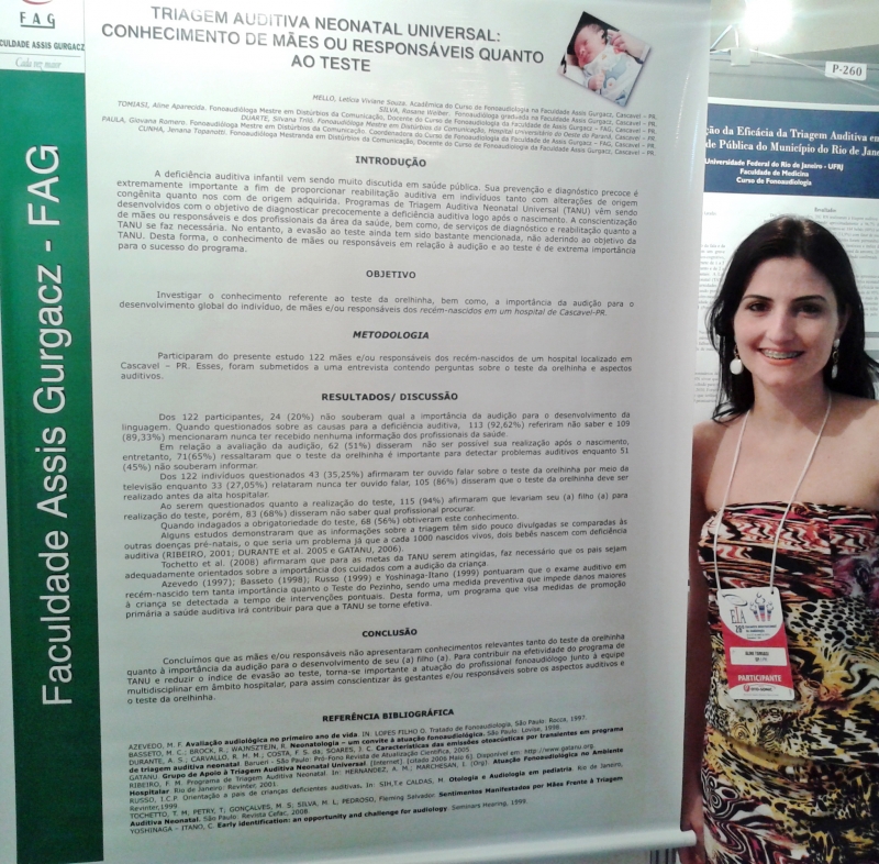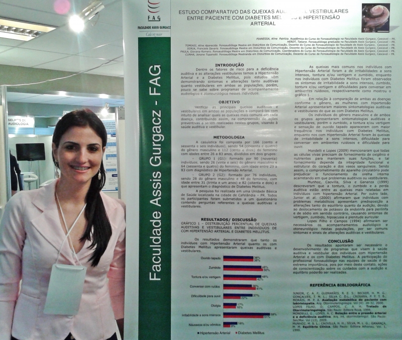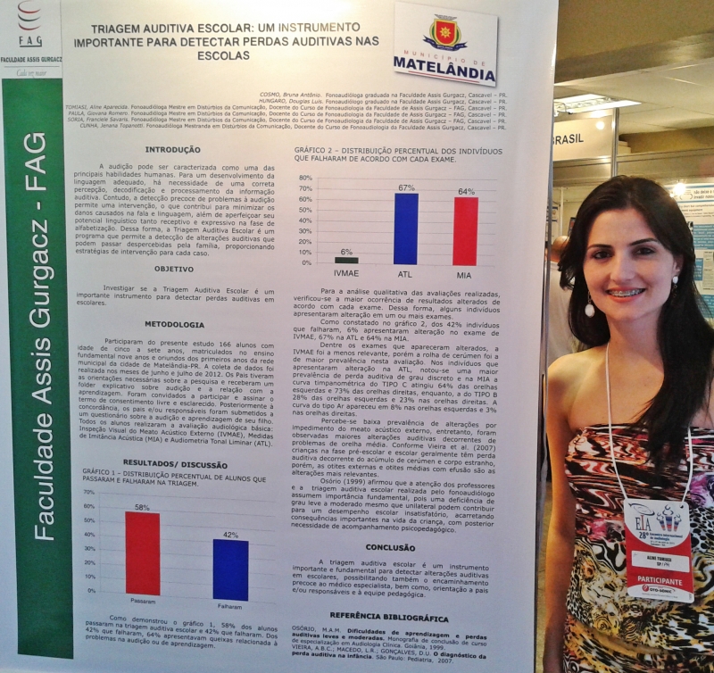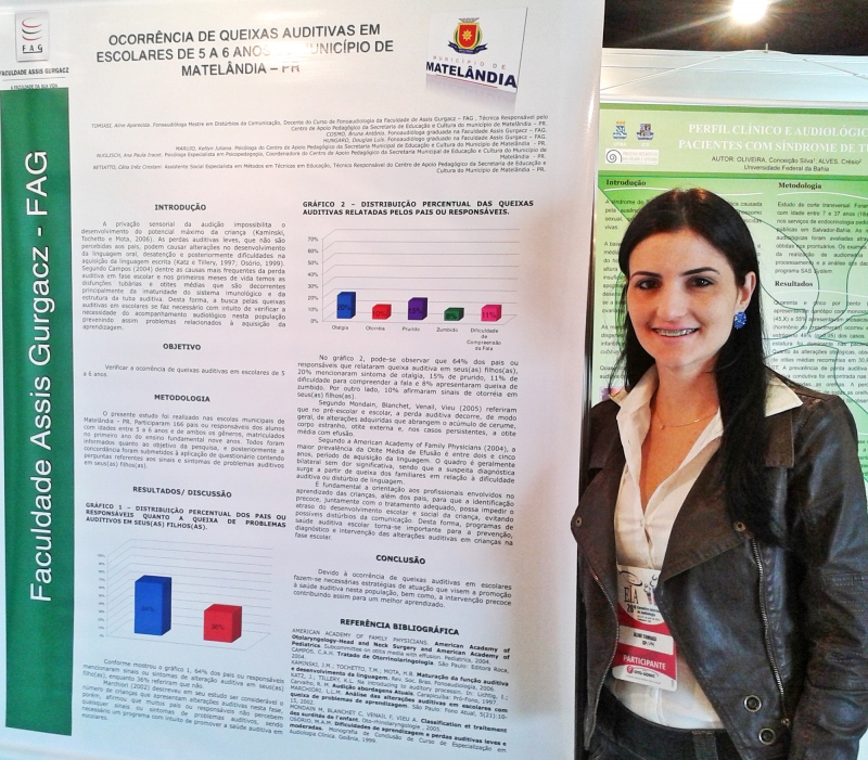 A docente do curso de Fonoaudiologia, Aline Tomiasi, esteve no 28º Encontro Internacional de Audiologia, em Salvador. A professora participou como ouvinte e também apresentou seis pesquisas sobre prevenção, diagnóstico e tratamento audiológico, desenvolvidas pelos acadêmicos da FAG. Para a Professora a iniciativa em realizar pesquisas científicas é de extrema importância para a formação profissional. "Por meio da pesquisa científica o acadêmico estimula respostas a hipóteses de problemas iniciais, sendo muitas vezes um processo complexo para os acadêmicos e futuros formandos", conta Aline. De acordo com a coordenadora do curso, professora Giovana Romero, a ação é um estímulo para que os docentes participem dessas atividades. "A pesquisa é uma forma de contribuir também para o constante aperfeiçoamento do aprendizado dos alunos", conta a coordenadora.