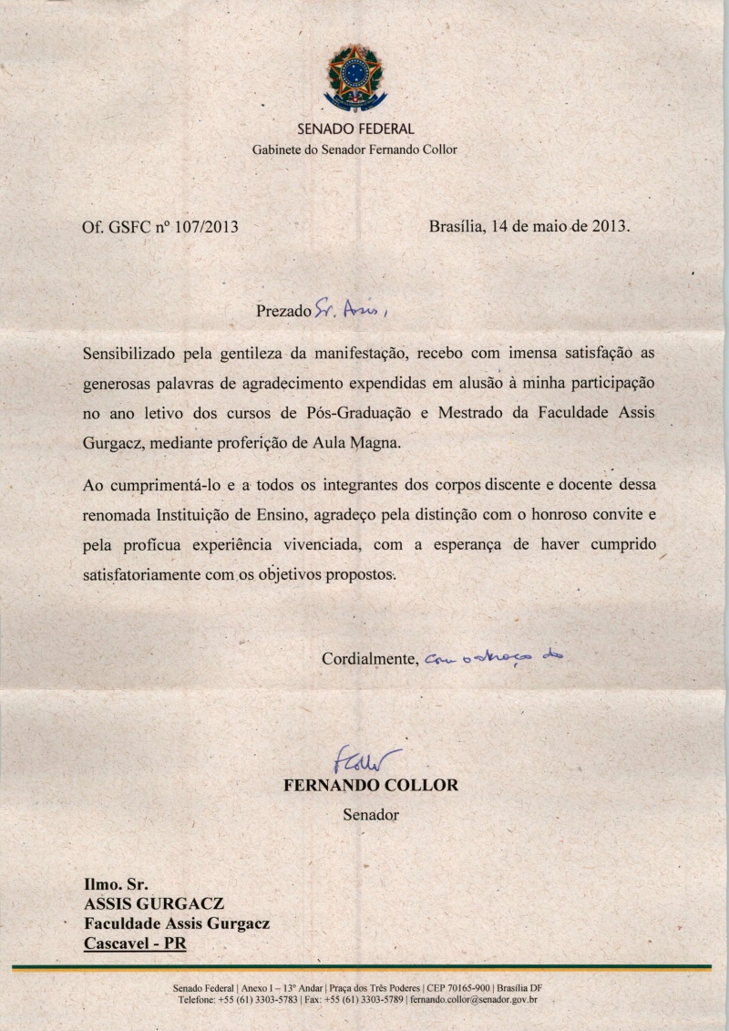 O senador da República, Fernando Collor, encaminhou à direção da Faculdade Assis Gurgacz, um ofício em agradecimento ao convite para ministrar a Aula Magna da Pós-Graduação. No texto, destinado ao instituidor da FAG, Assis Gurgacz, Collor cumprimentou ao corpo discente e docente da faculdade. "Agradeço a destinação com o honroso convite e pela profícua experiência vivenciada", destacou. Collor esteve no campus da FAG para a palestra que marcou o início do ano letivo da Pós-Graduação. O evento lotou o Anfiteatro da Reitoria de estudantes e empresários.