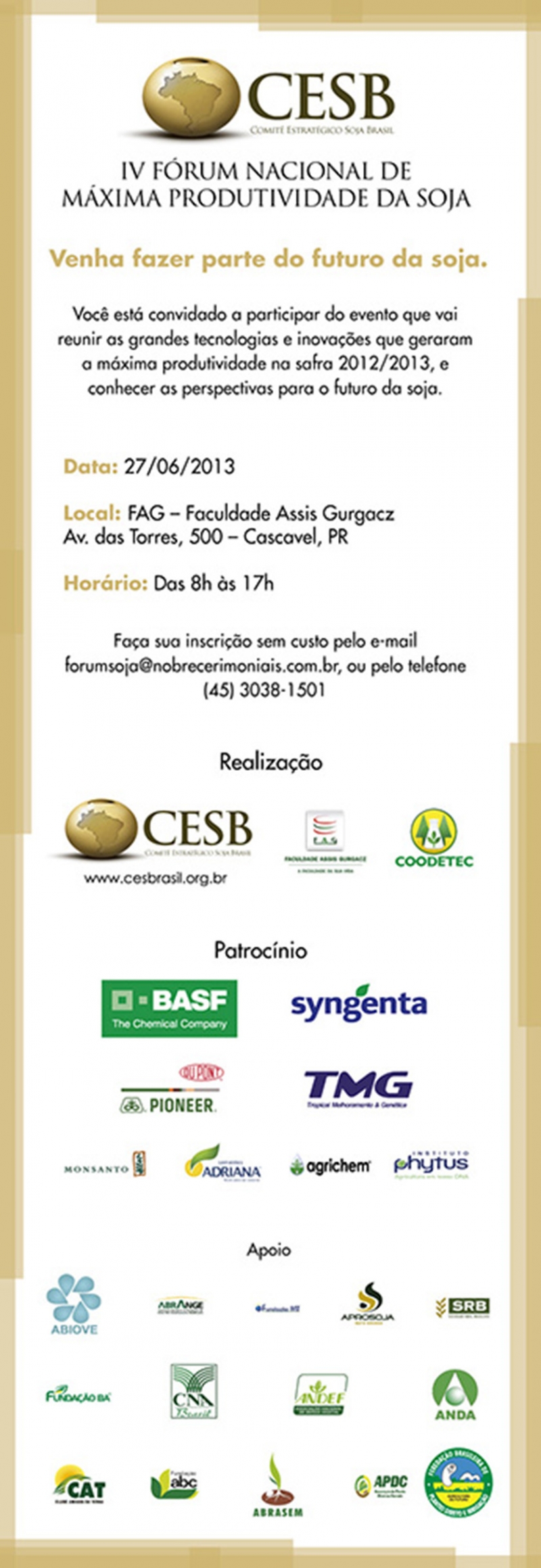 A graduação de Agronomia é parceira do Fórum Nacional de Produtividade Máxima de Soja, o evento acontece no dia 27 deste mês, das 8h às 17h, no campus da Faculdade Assis Gurgacz. As inscrições são gratuitas e podem ser feitas no e-mail: [email protected] ou no telefone: (45) 3038 1501.